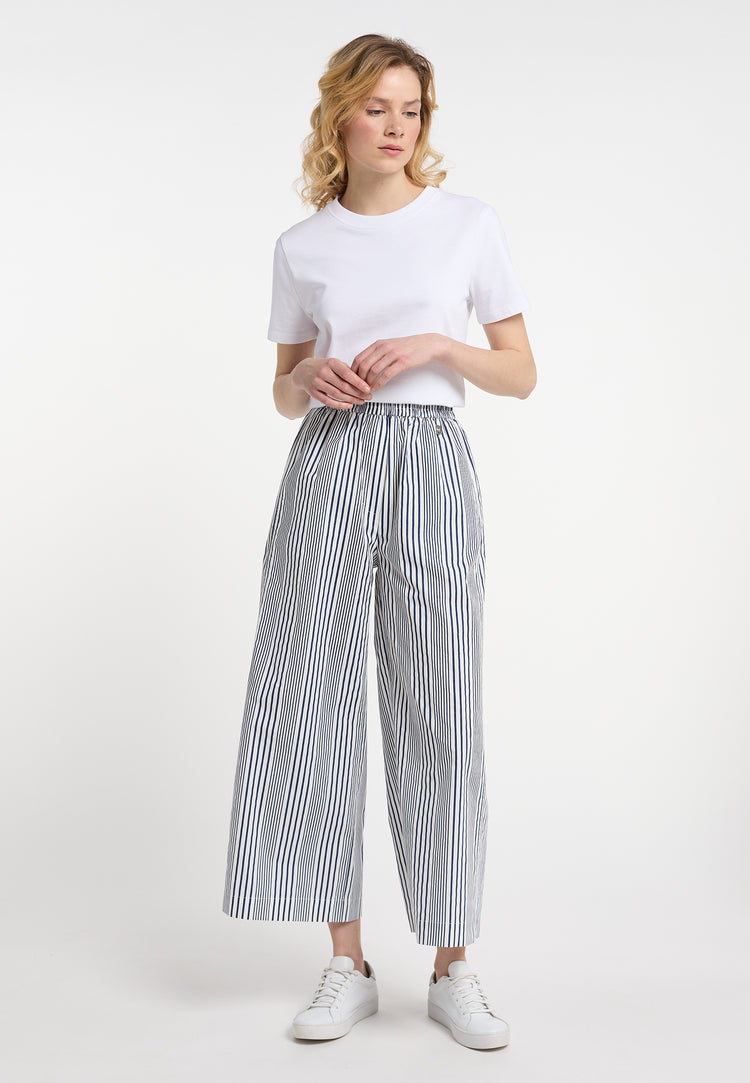 Perfekt für einen Spaziergang entlang der Strandpromenade: Die sommerlichen Culottes von DreiMaster Maritim überzeugen mit ihren weiten Hosenbeinen und dem maritimen Streifenmuster. Ein bequemer, elastischer Bund und das angenehme Material aus reiner Baumwolle sorgen für hohen Tragekomfort. Das Modell wird durch zwei große Seitentaschen abgerundet.