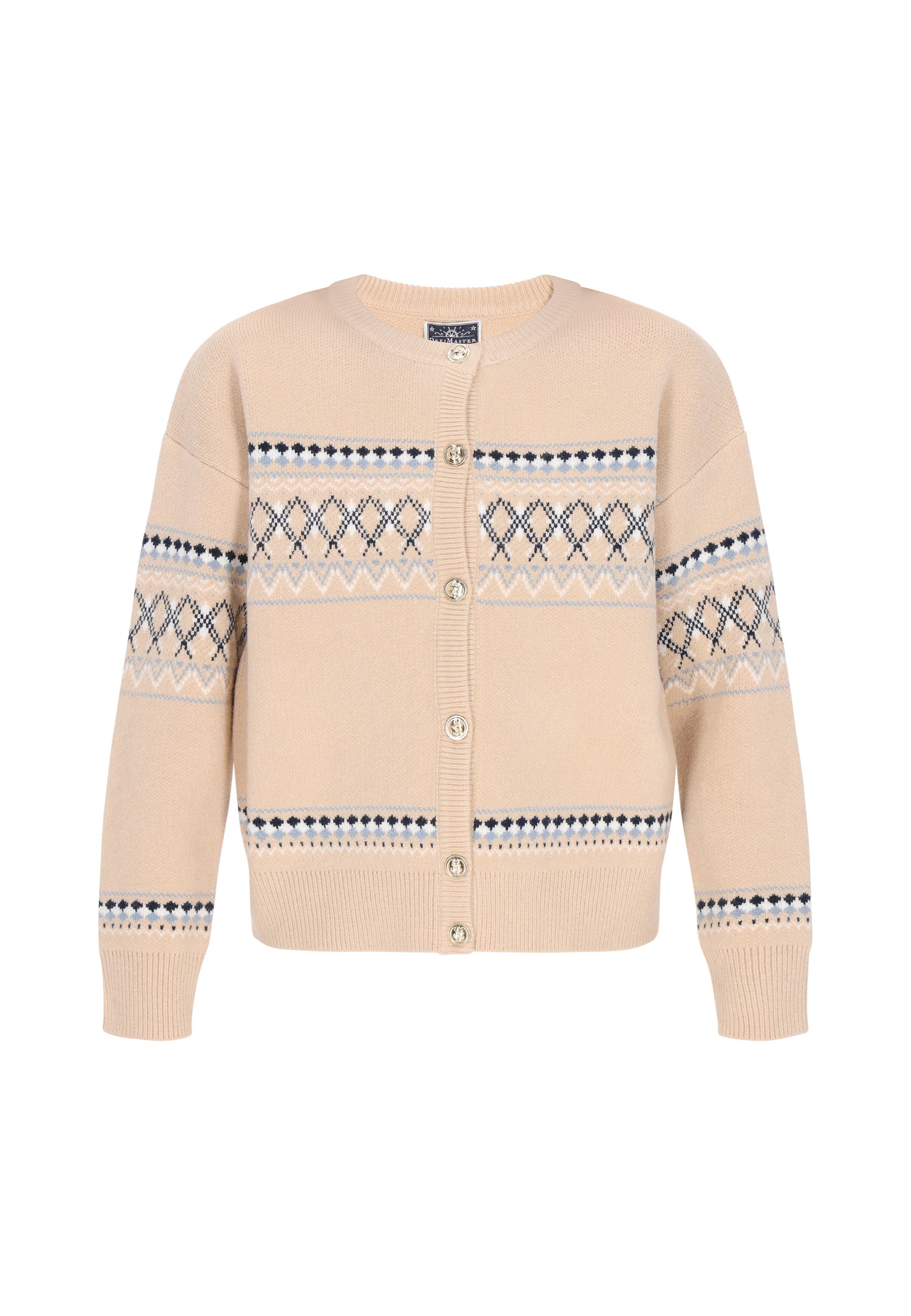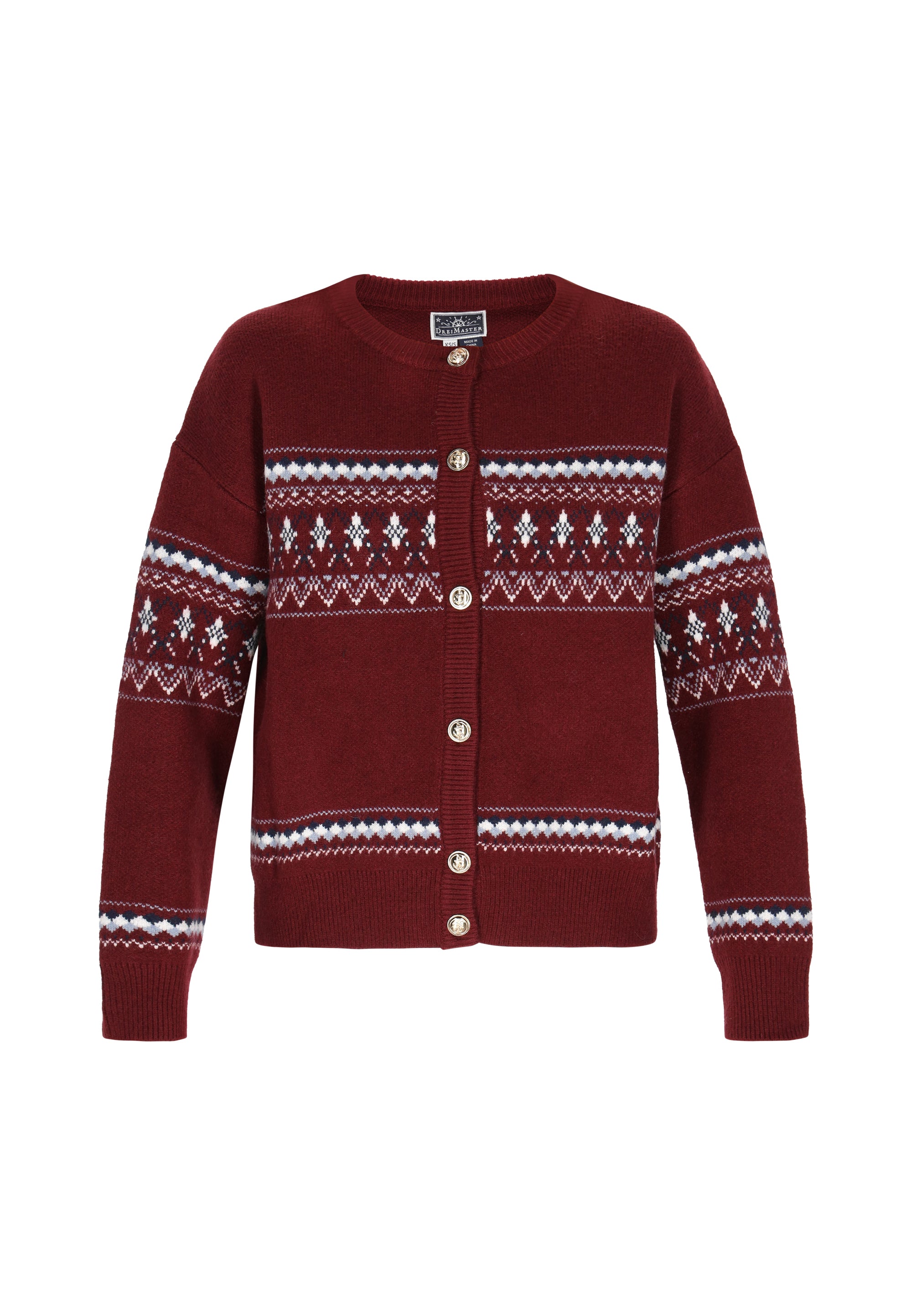 Genießen Sie gemütlichen, zeitlosen Stil mit diesem locker sitzenden Cardigan aus der DreiMaster Maritim Kollektion. Mit klassischem Rundhalsausschnitt, überschnittenen Schultern und langen Ärmeln lässt er sich vorne mit Knöpfen schließen und ist somit ideal zum Schichten. Hergestellt aus weichem Strickstoff, verziert mit einem traditionellen Norwegermuster, verbindet dieses bequeme Kleidungsstück lässigen maritimen Charme mit Alltagstauglichkeit – perfekt, um Ihrer saisonalen Garderobe Wärme und Stil zu verleihen.