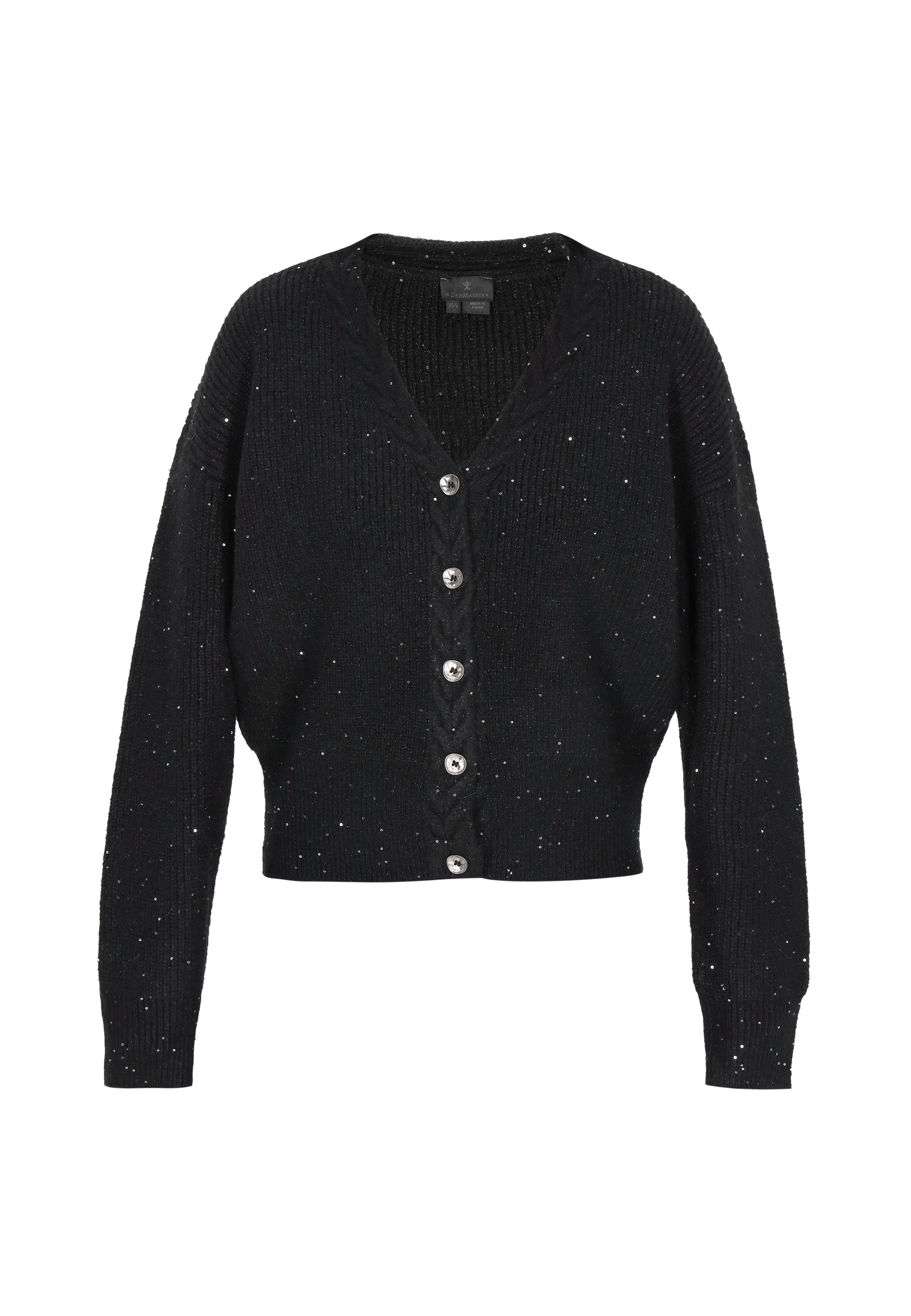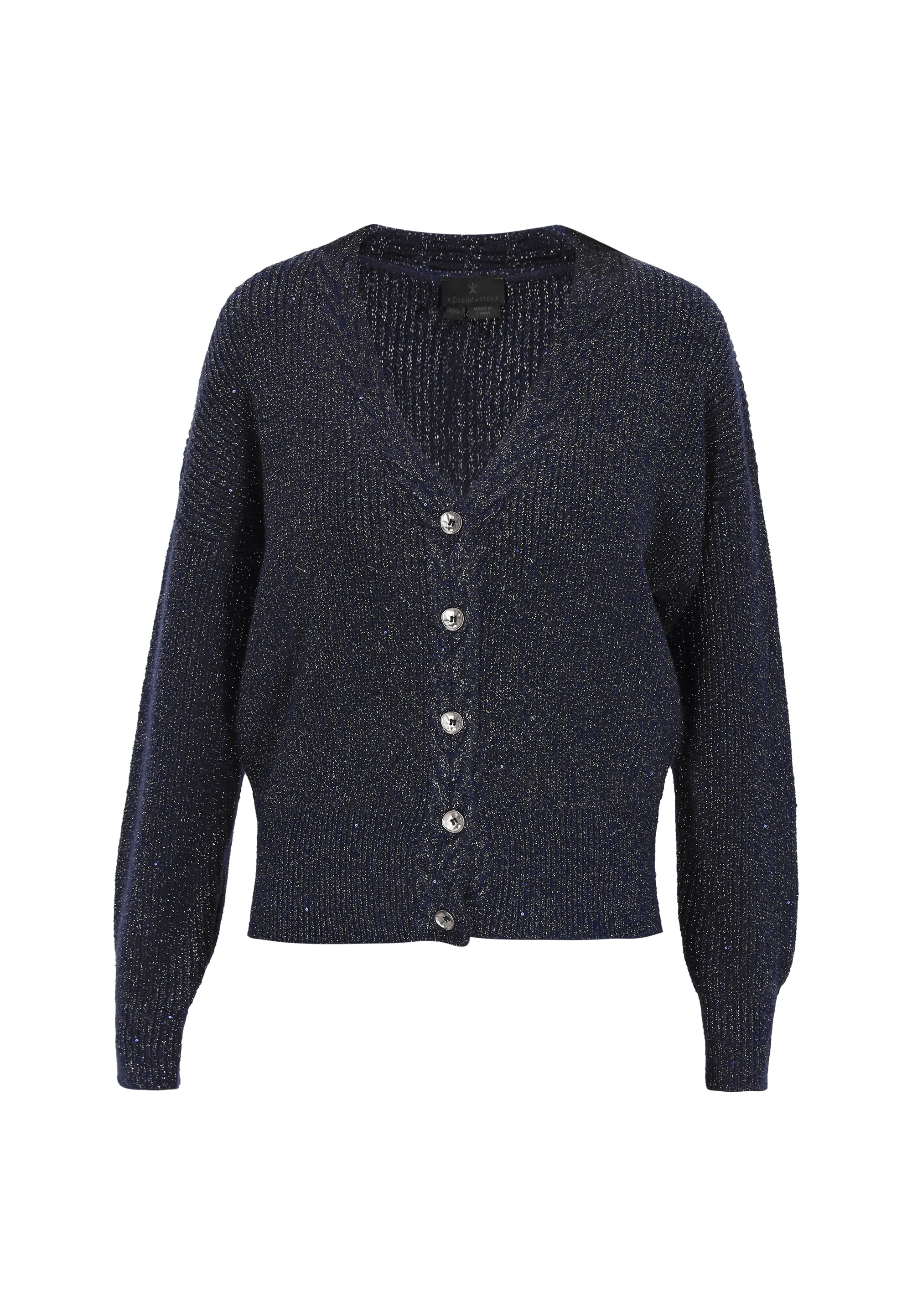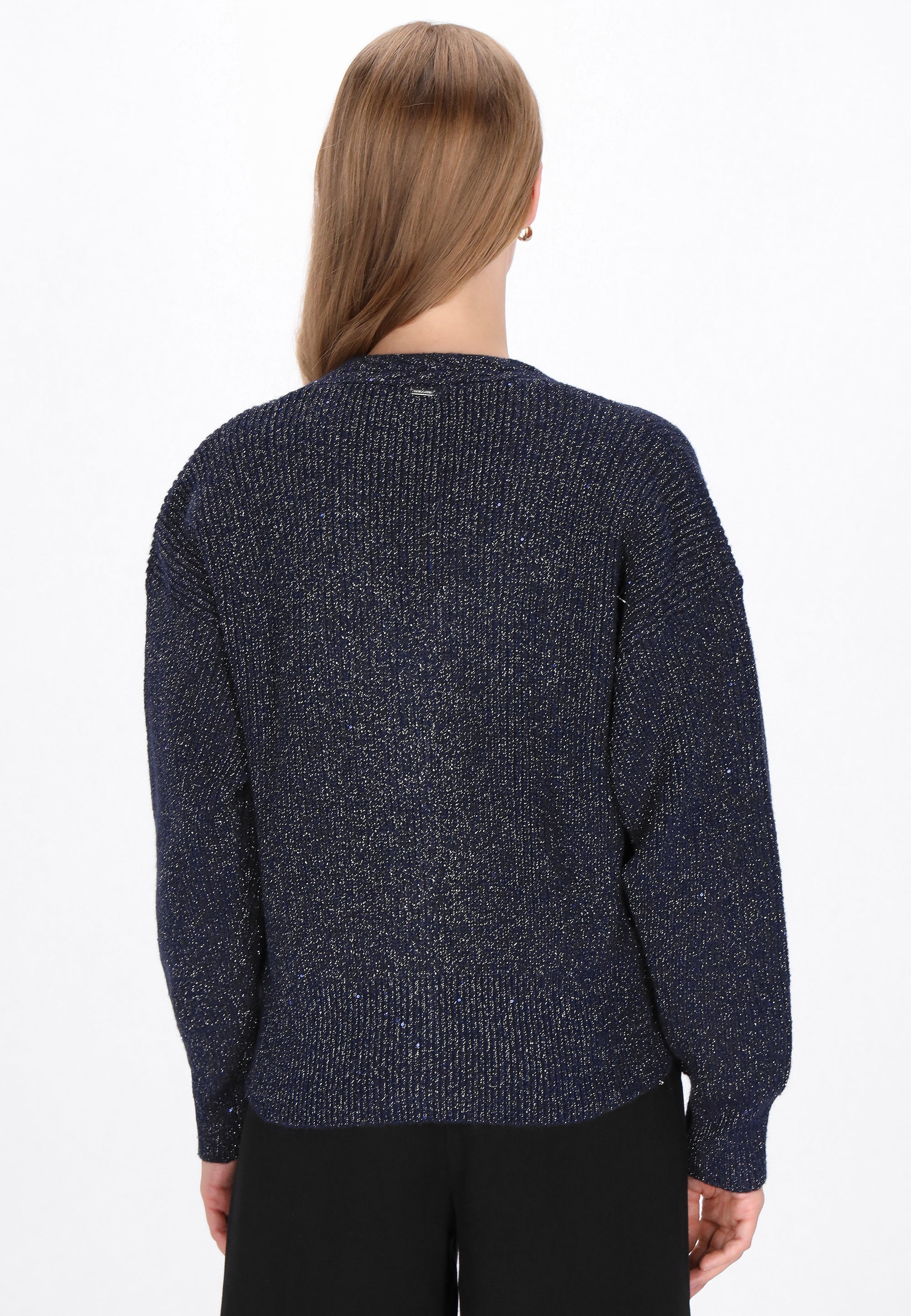 Dieser elegante Cardigan aus der DreiMaster Klassik Kollektion verbindet Komfort mit einem dezenten Glanz. Hergestellt aus weichem Strickstoff, verfügt er über eine lockere Passform, einen V-Ausschnitt und überschnittene Schultern für Bewegungsfreiheit und Komfort. Mit Knöpfen geschlossen und mit Pailletten sowie schimmerndem Garn verziert, zeigt er ein zartes, schimmerndes Muster kombiniert mit einem klassischen Zopfmuster. Dieser stilvolle und bequeme Cardigan ist perfekt für sowohl klassische als auch elegantere Outfits und verleiht einen Hauch von Chic und einzigartigem Charakter.