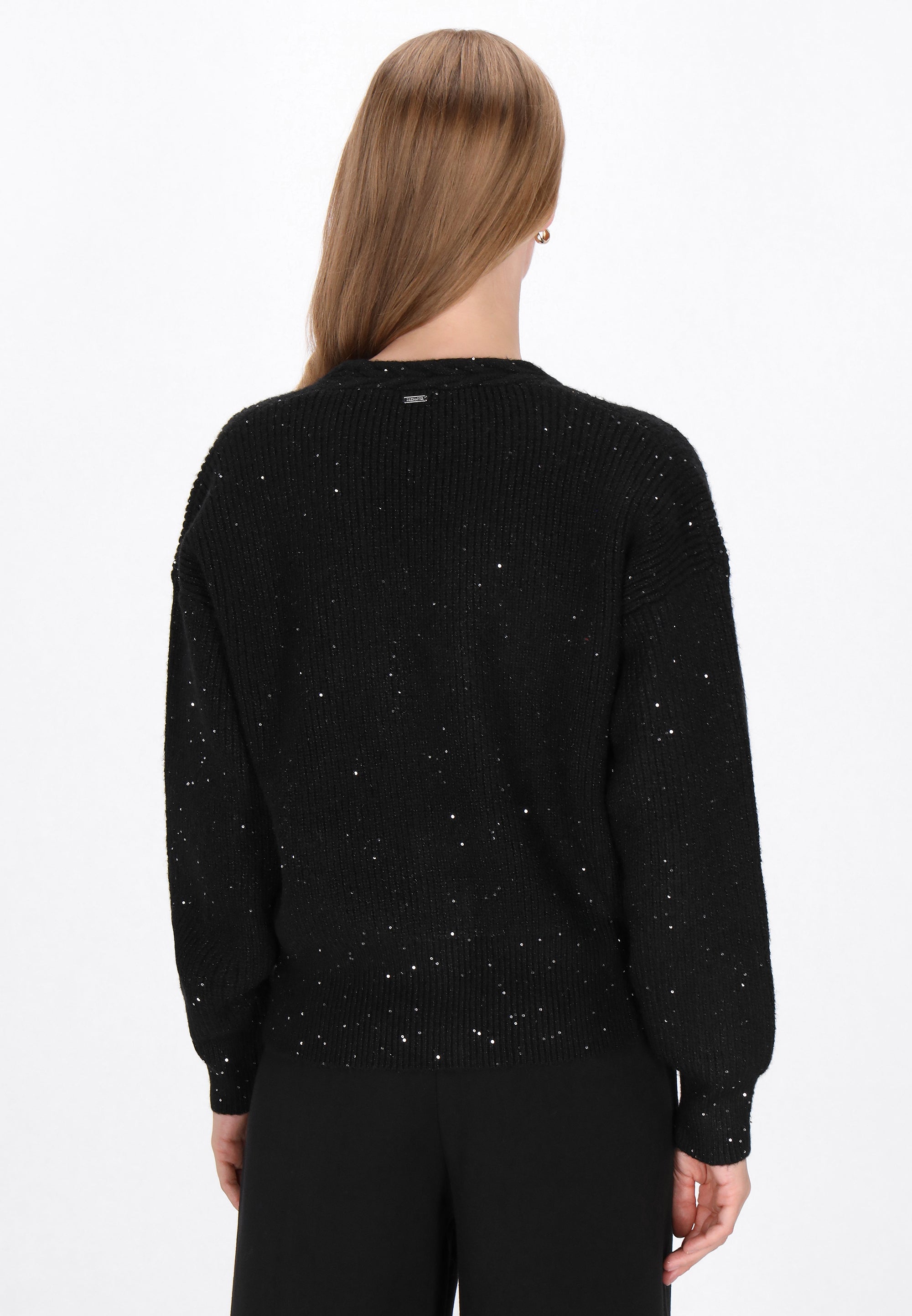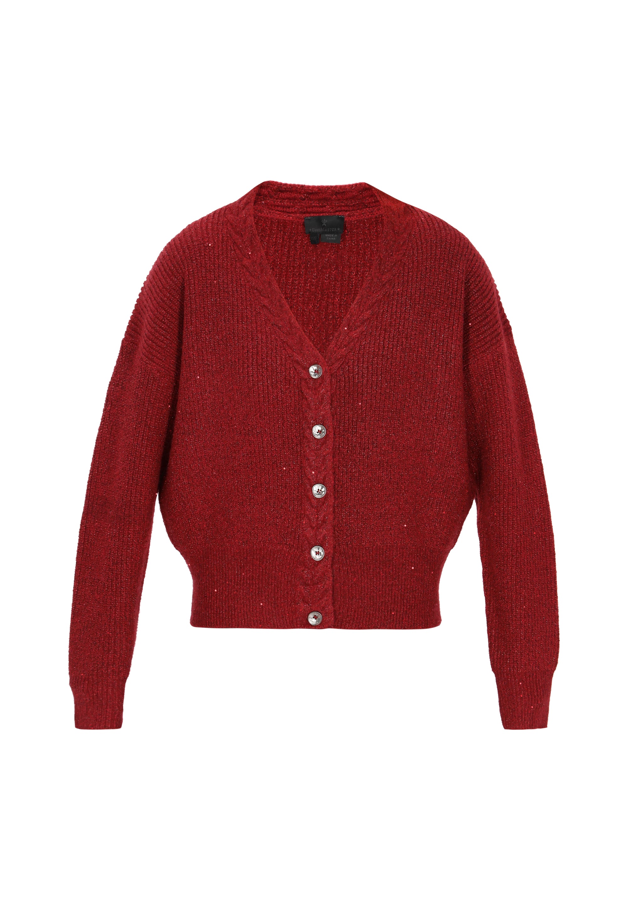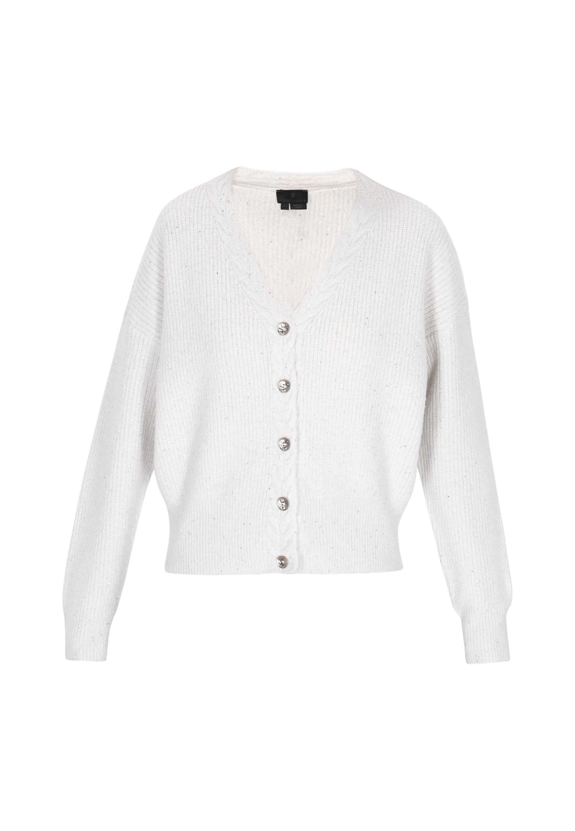 Dieser elegante Cardigan aus der DreiMaster Klassik Kollektion verbindet Komfort mit einem dezenten Glanz. Hergestellt aus weichem Strickstoff, verfügt er über eine lockere Passform, einen V-Ausschnitt und überschnittene Schultern für Bewegungsfreiheit und Komfort. Mit Knöpfen geschlossen und mit Pailletten sowie schimmerndem Garn verziert, zeigt er ein zartes, schimmerndes Muster kombiniert mit einem klassischen Zopfmuster. Dieser stilvolle und bequeme Cardigan ist perfekt für sowohl klassische als auch elegantere Outfits und verleiht einen Hauch von Chic und einzigartigem Charakter.