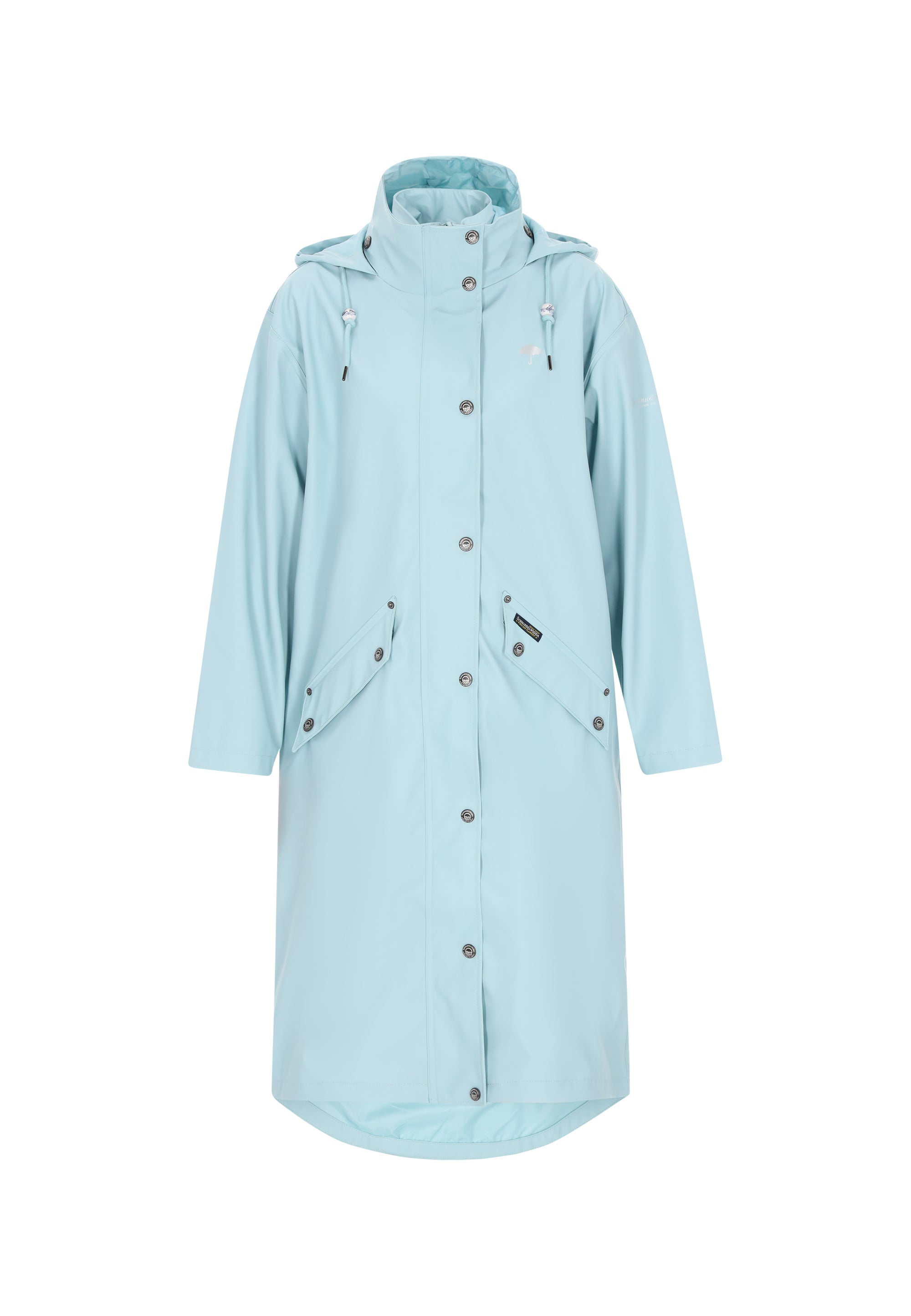 polyester in a plain pattern and printed details, this item features waterproof fabric rated at 3000mm and fully sealed seams for reliable rain protection. The drop shoulder, snap-button closure and adjustable drawstring enhance its functional appeal, while spacious flap pockets keep essentials close at hand. Both windproof and versatile, this raincoat is the perfect blend of utility and modern minimalism.