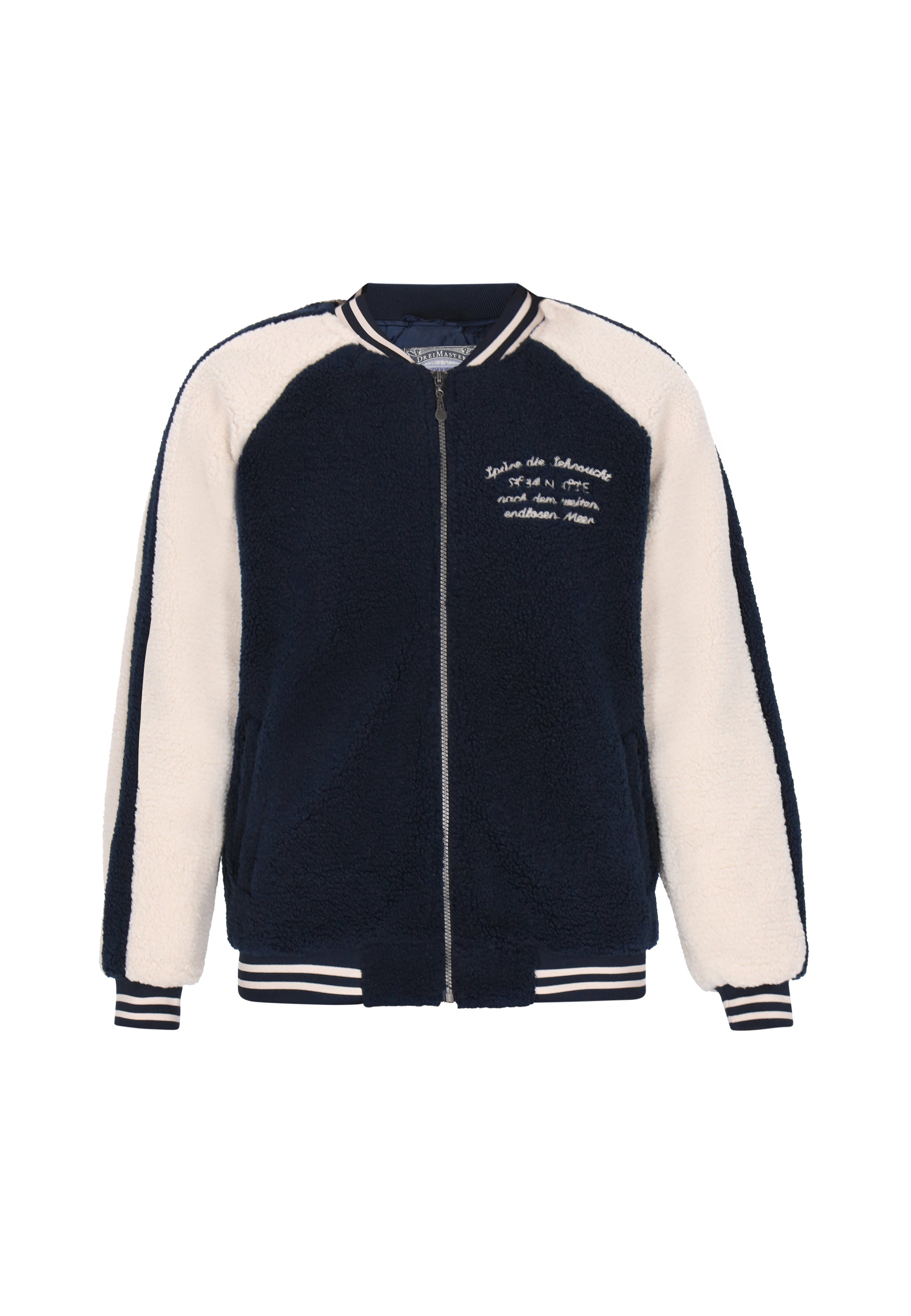 This jacket from the DreiMaster Vintage Collection combines comfort and timeless style. Its relaxed fit allows for ease of movement, while the ribbed collar and long sleeves with raglan seams add a sporty touch. Featuring a zipper closure, it's perfect for both casual and more active outfits. Made of soft teddy-style material, the jacket is soft and warm, while embroidered details emphasize its unique character. Colorful panels add a modern touch, and practical pockets enhance functionality. Perfect for casual outfits and everyday, comfortable outfits.
