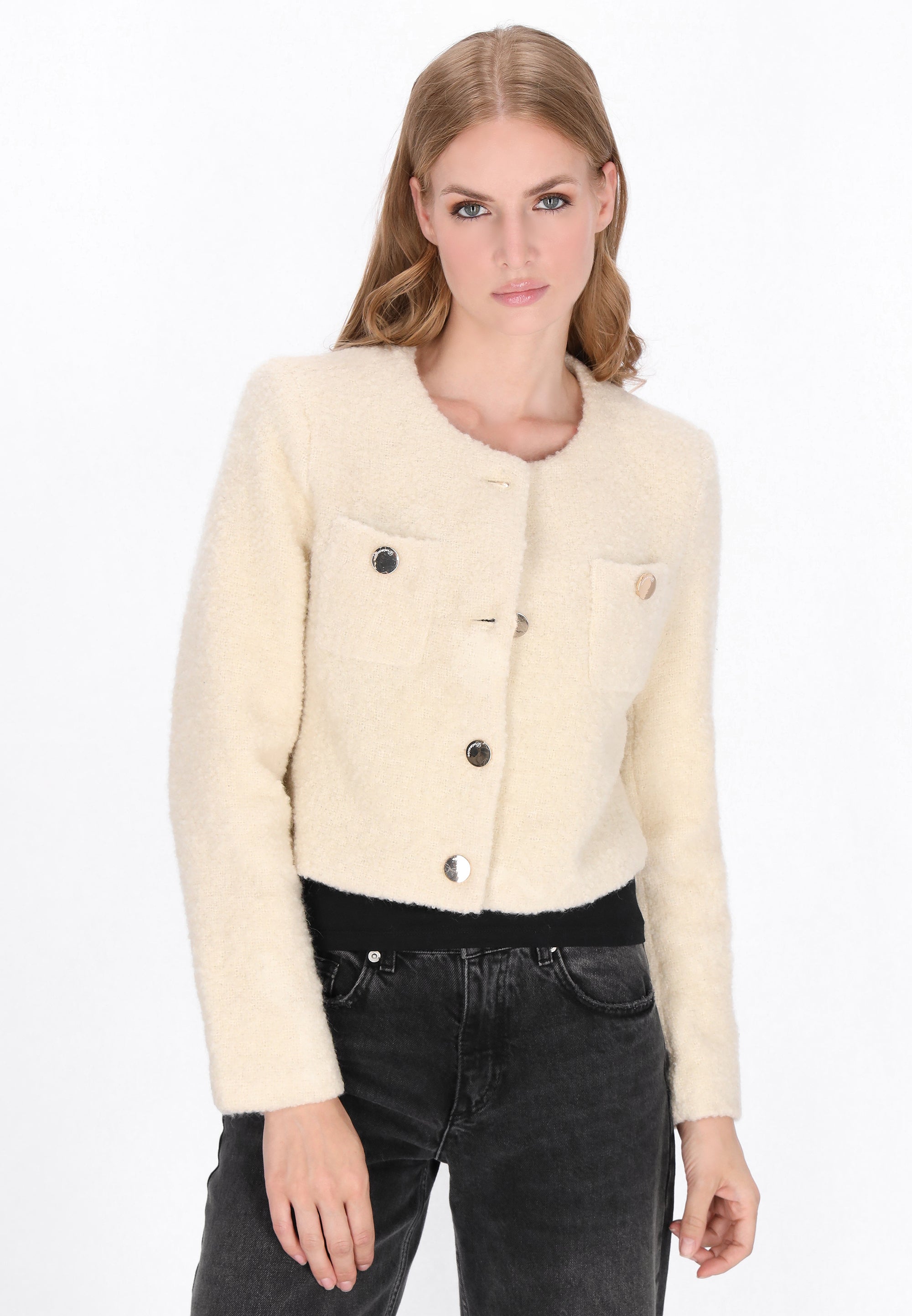 A stylish blazer from the Vintage Collection that combines casual laid-back with a touch of retro elegance. Made of teddy material that is pleasant to the touch, it provides comfort and warmth on colder days. The regular fit with a shorter cut accentuates the silhouette, while the round neckline and long sleeves add a classic, timeless touch. The smooth fabric and button closure are complemented by practical chest pockets. An ideal choice for everyday styling in the spirit of vintage.