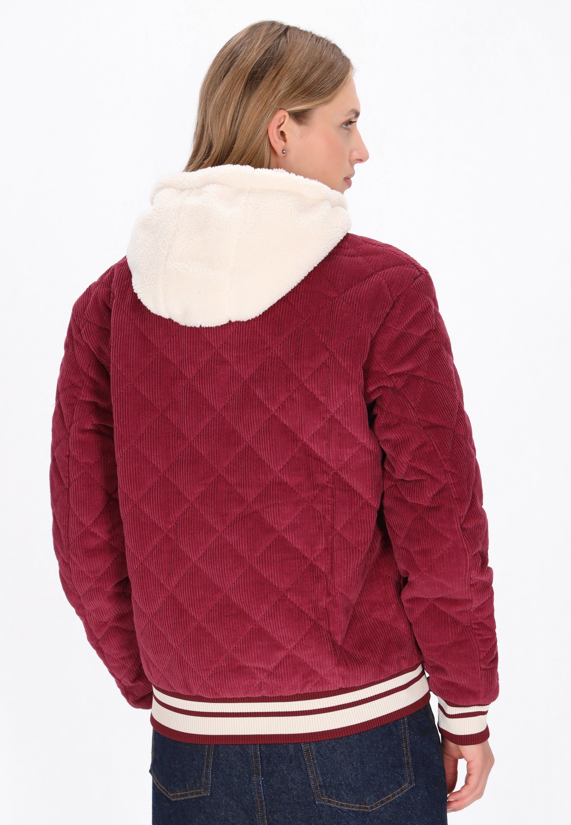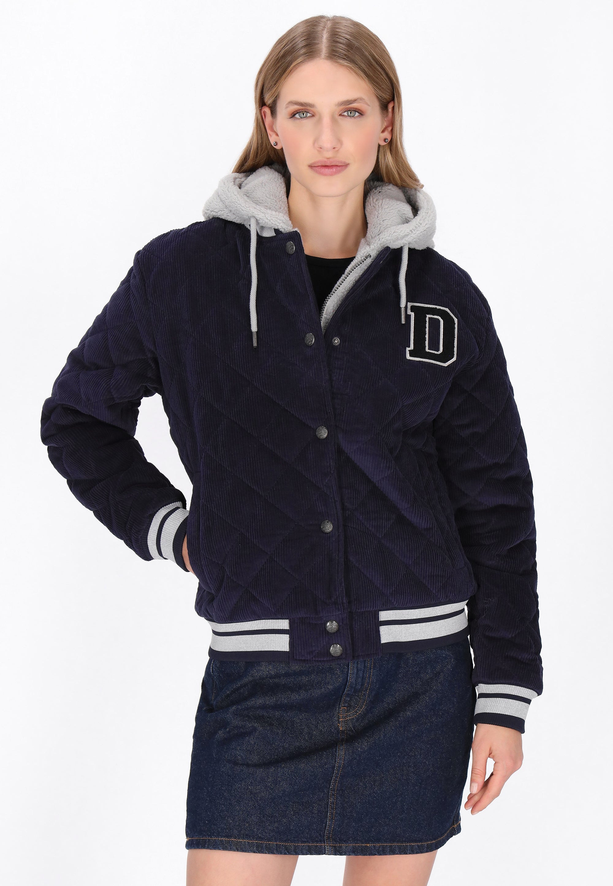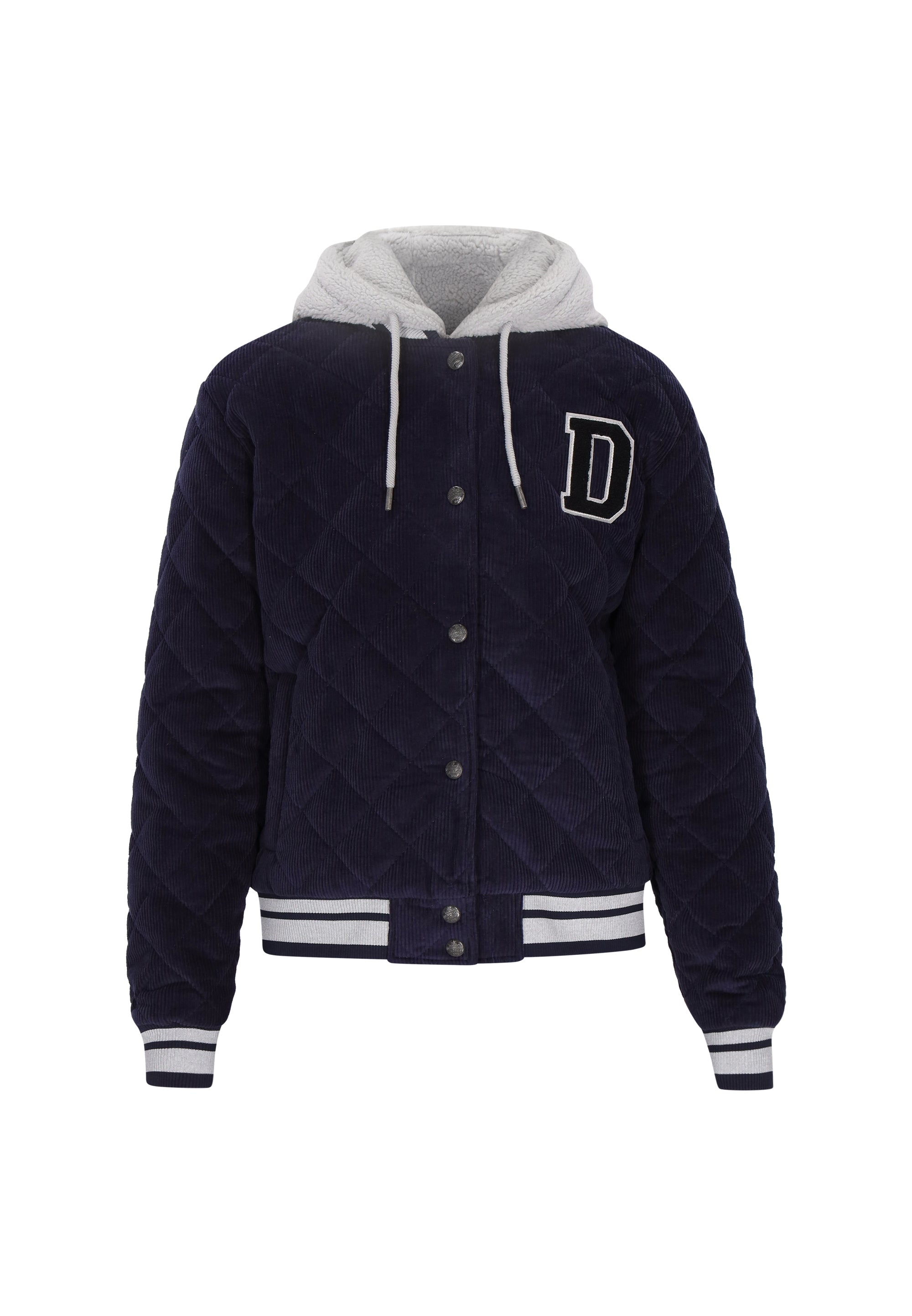 A stylish, regular-fit college jacket, perfect for everyday wear. Featuring a hood and long sleeves, it combines classic styling with modern comfort. It fastens with snaps, features practical pockets, and a ribbed hem for a comfortable fit. Contrasting trims and meticulously crafted embroidery give it a distinctive, timeless character. A combination of materials such as corduroy, teddy, and quilted panels adds a unique texture and vintage-inspired style. This incredibly comfortable jacket is perfect for those who appreciate a casual yet stylish look.