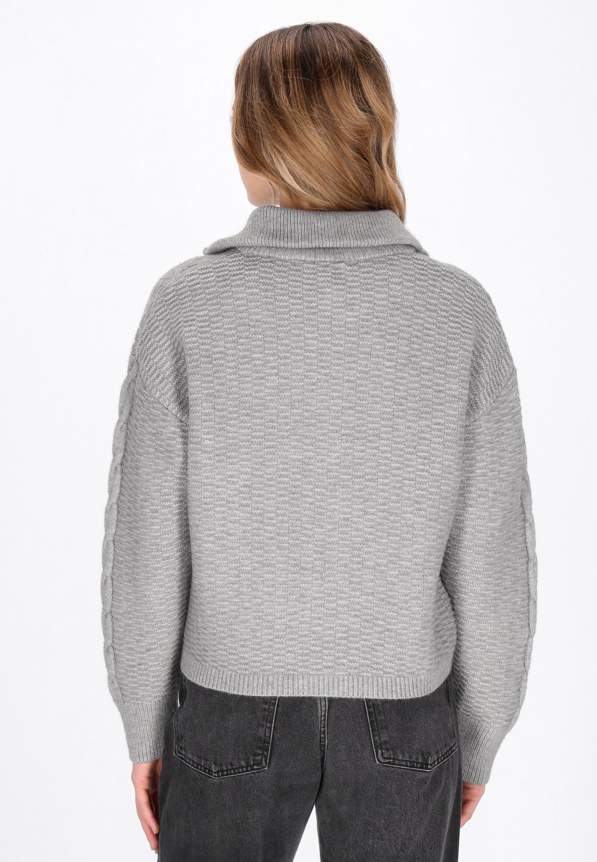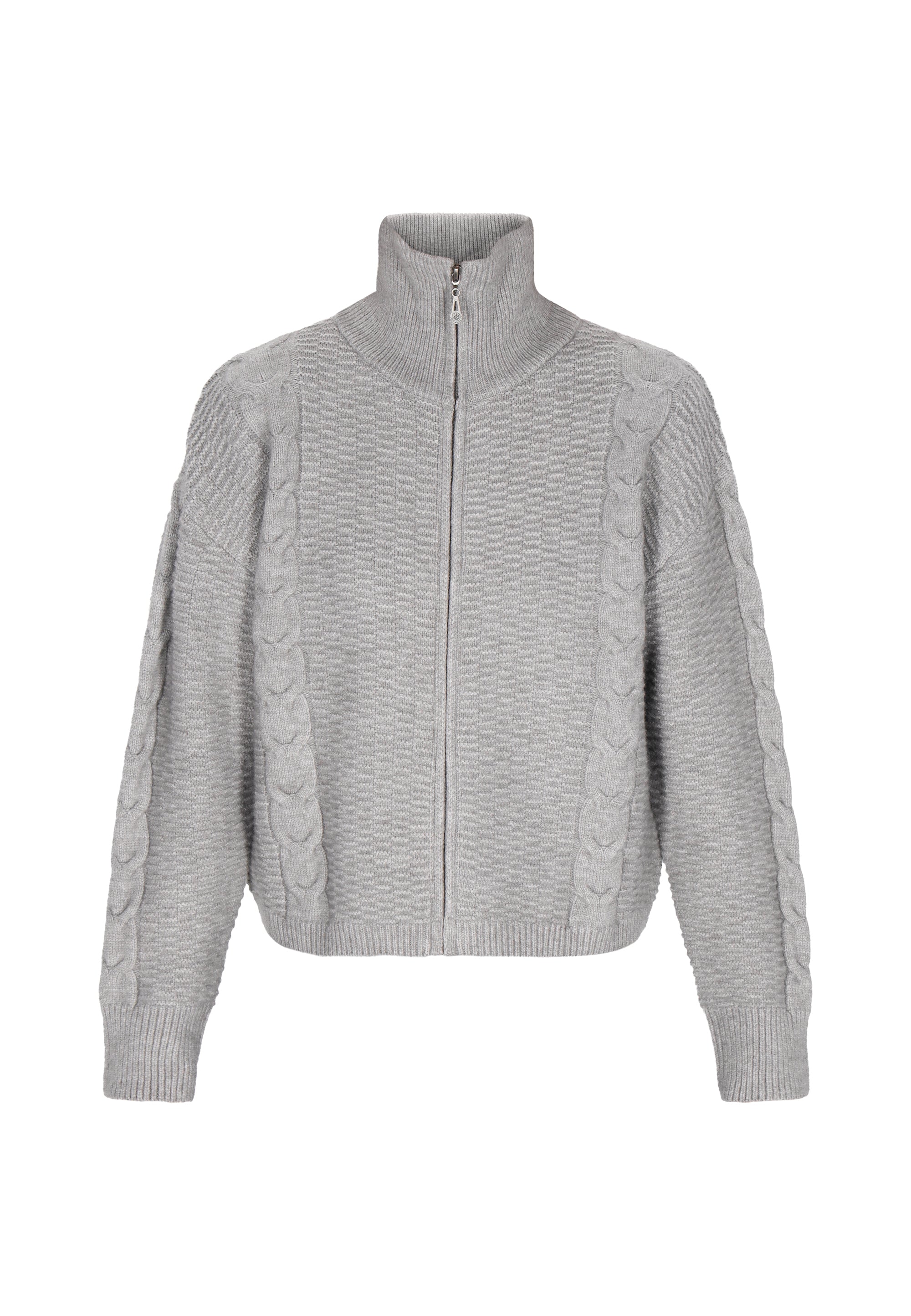 Keyword: cable pattern, cardigan, casual, comfortable, drop shoulder, knitted, long sleeves, relaxed fit, stand collar, timeless, vintage collection, zip-up