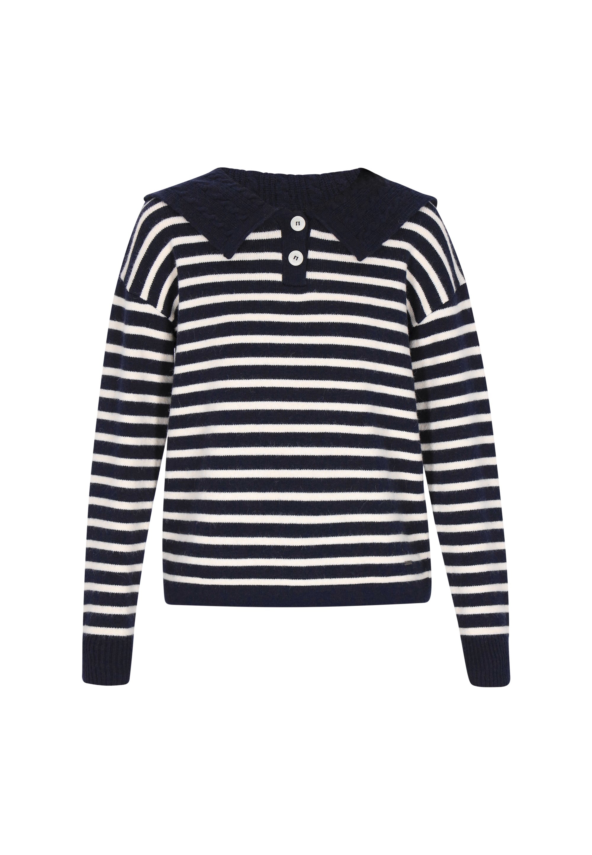 Embrace vintage charm with this relaxed-fit knitted sweater from the Vintage Collection. Featuring a distinctive sailor collar adorned with a classic cable pattern and a neat button placket, it effortlessly combines timeless style with everyday comfort. The drop shoulder design and long sleeves create a relaxed silhouette, while the striped pattern adds subtle texture. Perfect for casual layering, this cozy sweater brings a charming vintage touch to your wardrobe.