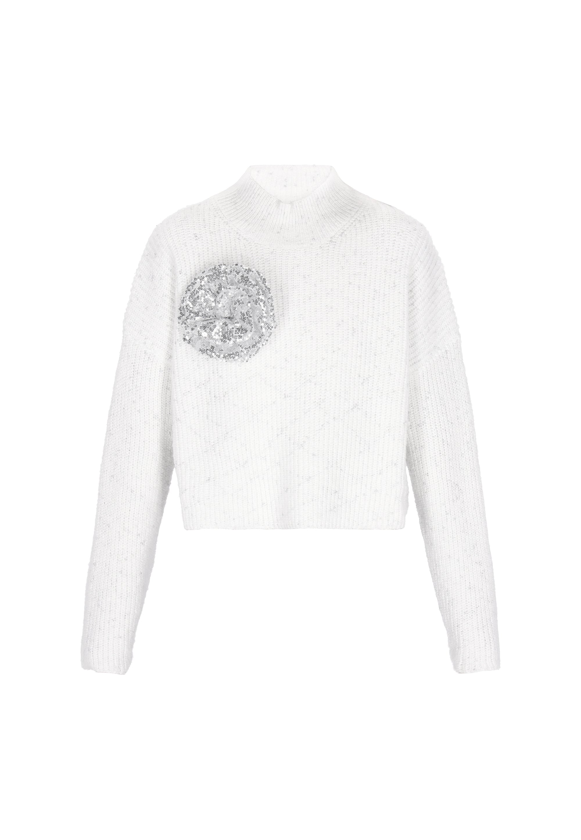 The Sweater from the Vintage Collection is a unique combination of classic form and subtle feminine details. The loose cut and lowered shoulder line provide comfort and a fashionable, casual look. The stand-up collar adds to the overall elegance and slightly protects from the cold. Made of soft, pleasant-to-touch knit fabric with a smooth texture, the sweater impresses with a floral appliqué decorated with delicate sequins that subtly shine, giving it a unique charm. It is a timeless, casual and comfortable model that perfectly fits the vintage style. It will be great for both everyday styling and more romantic, feminine ensembles.