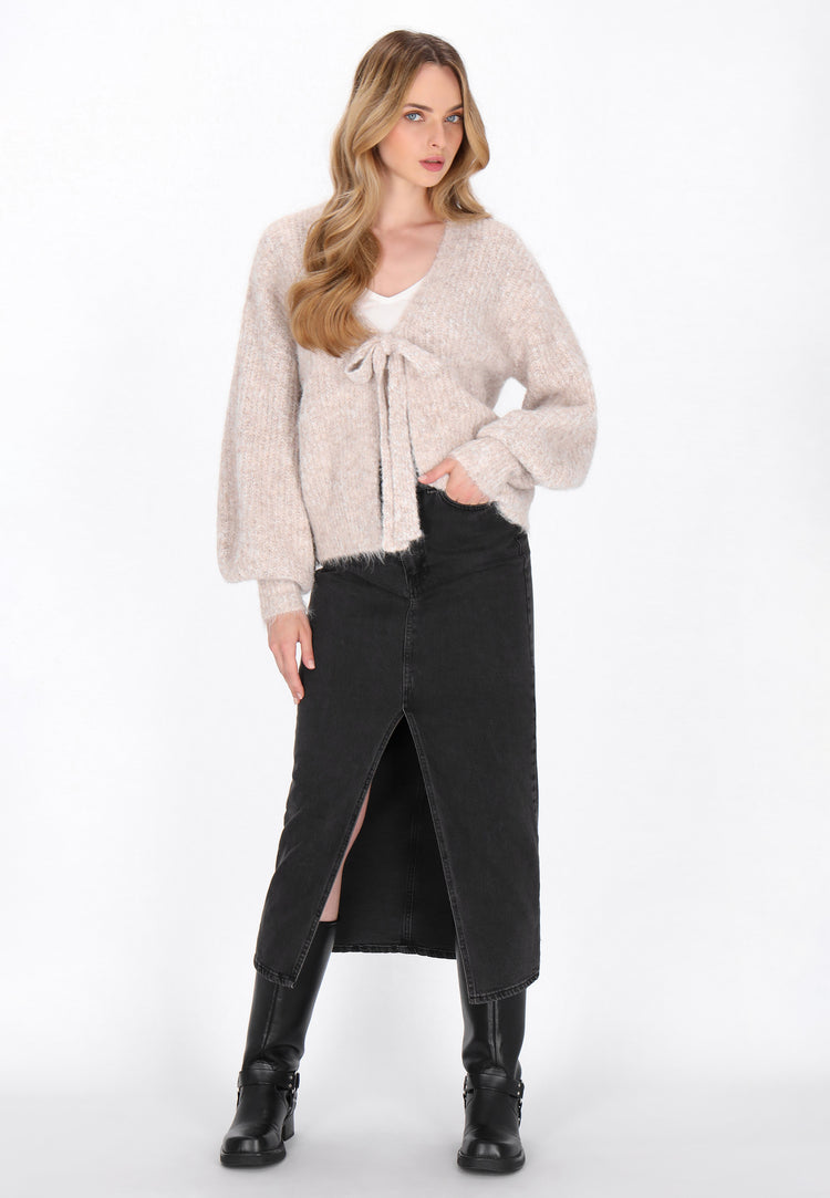 This cardigan from the Vintage Collection is the perfect choice for lovers of classics with a touch of romance. The loose cut and lowered shoulder line ensure freedom and comfort, while the long, bishop sleeves add subtle volume to the silhouette. The cardigan features a heart neckline and a tie at the waist to slightly accentuate the waist. Made of soft, knitted fabric with a smooth texture, it is extremely comfortable and pleasant to the touch. It's a timeless, casual vintage-inspired closet model that will go well with both everyday styling and more feminine ensembles.