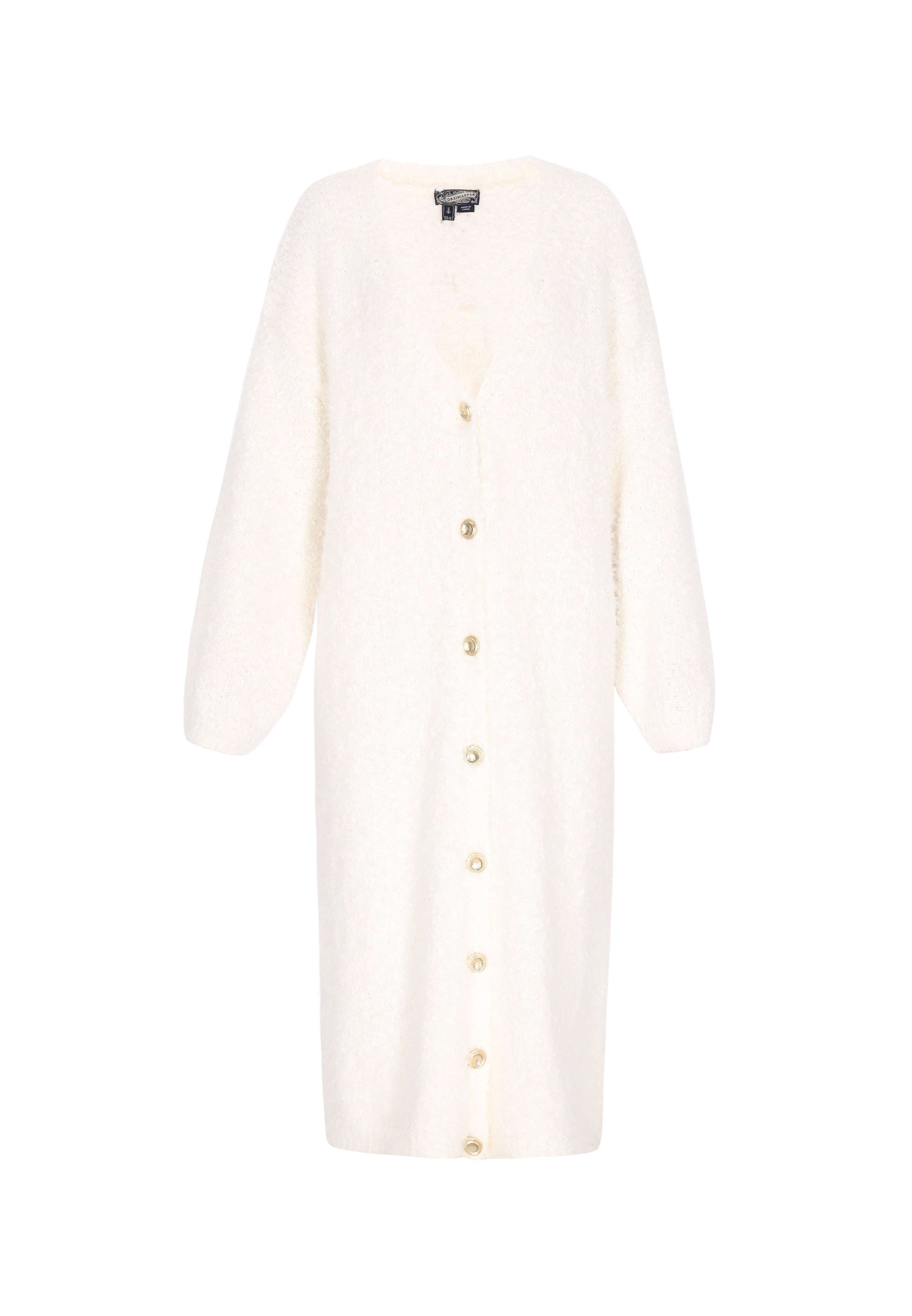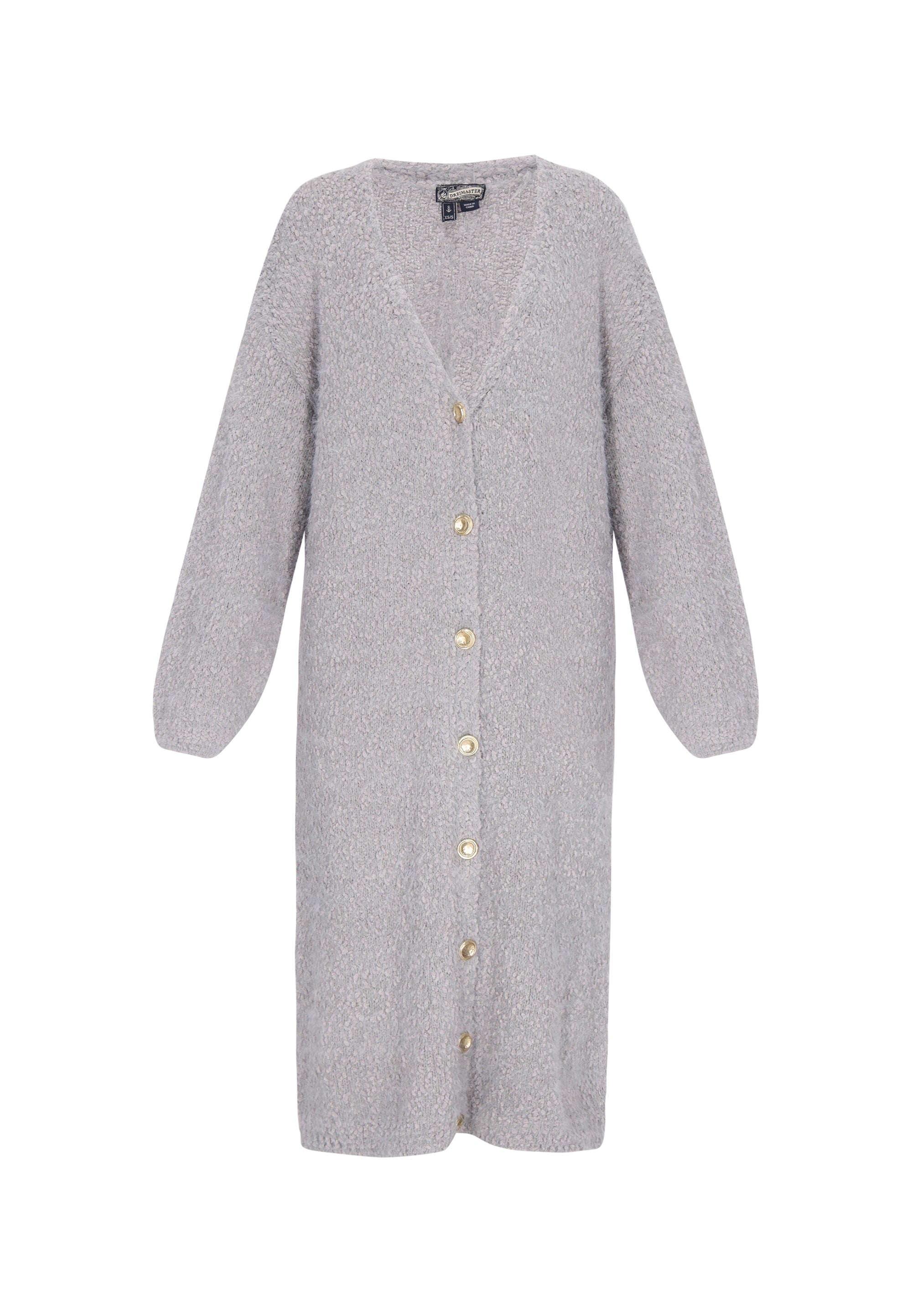 Wrap yourself in cozy sophistication with this relaxed-fit bouclé cardigan from the Vintage Collection. Featuring a long silhouette, V-neck, and drop shoulders, it offers a casual yet timeless look. The button-up front and plain pattern keep it versatile and classic, while the soft bouclé fabric ensures comfort for all-day wear. Perfect for layering, this cardigan combines effortless style with vintage charm.