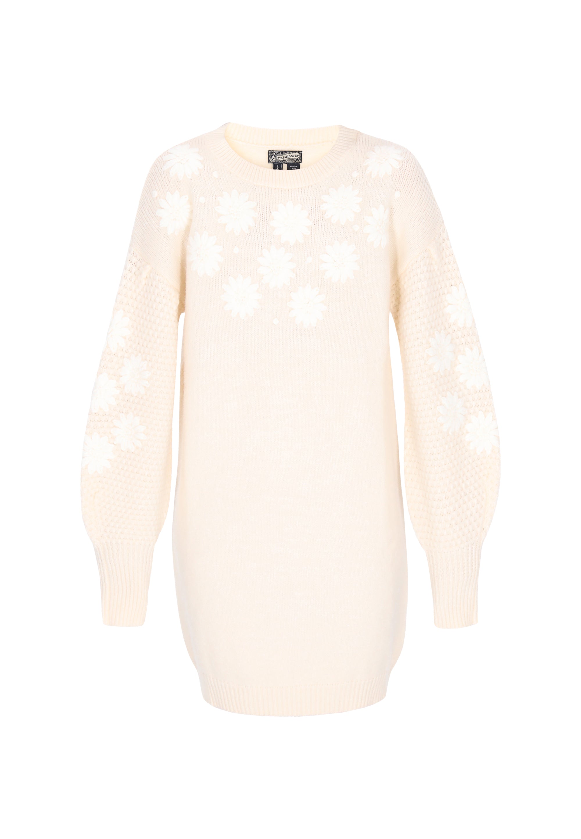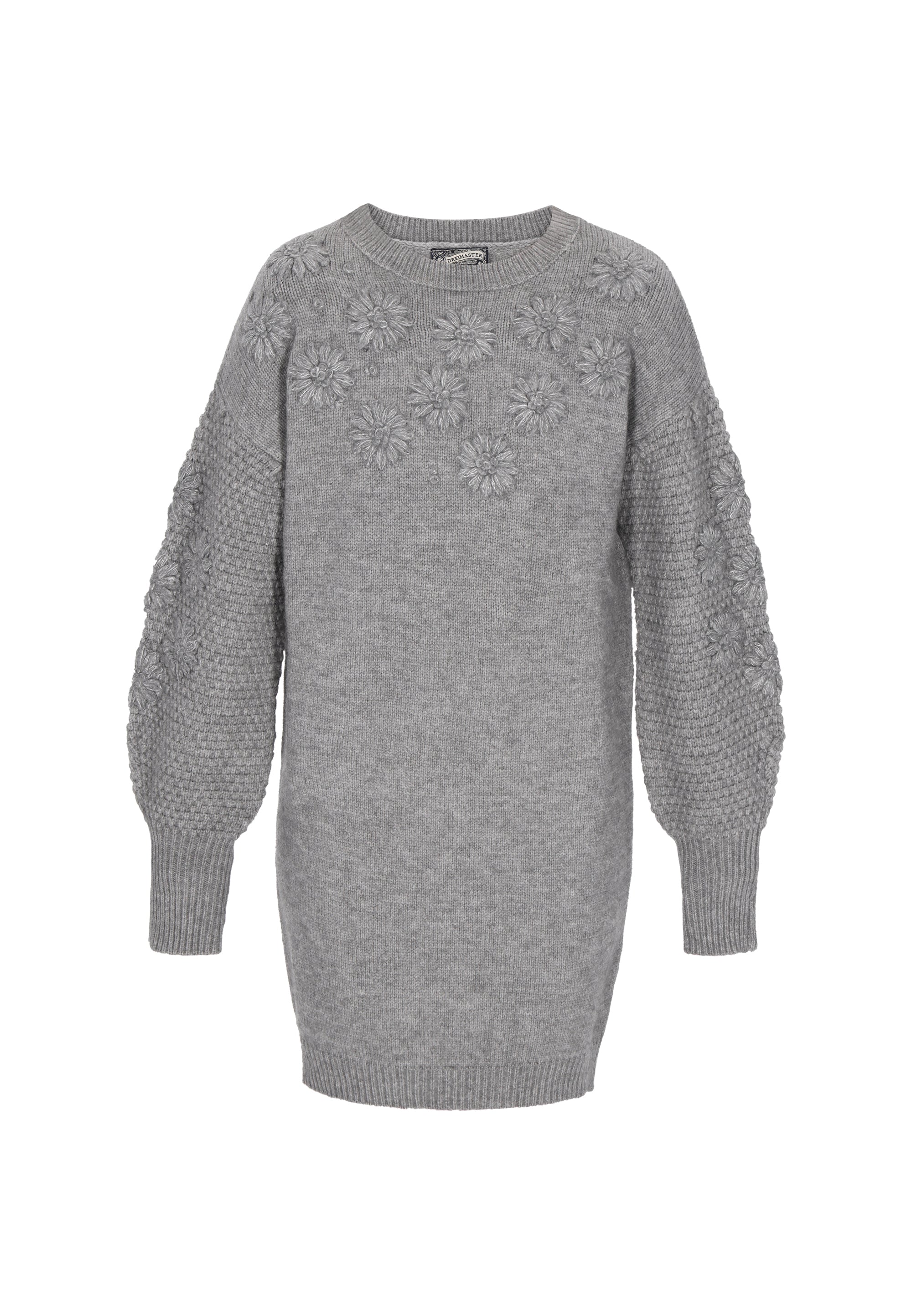 A loose-fitting mini dress with a round neckline and long, puffed sleeves. Crafted from soft knit fabric, it's adorned with subtle floral embroidery, giving it a delicate, romantic feel. It offers comfort and coziness, and its timeless design is perfect for everyday styling. This model is from the Vintage Collection, inspired by classic styles with a retro touch.