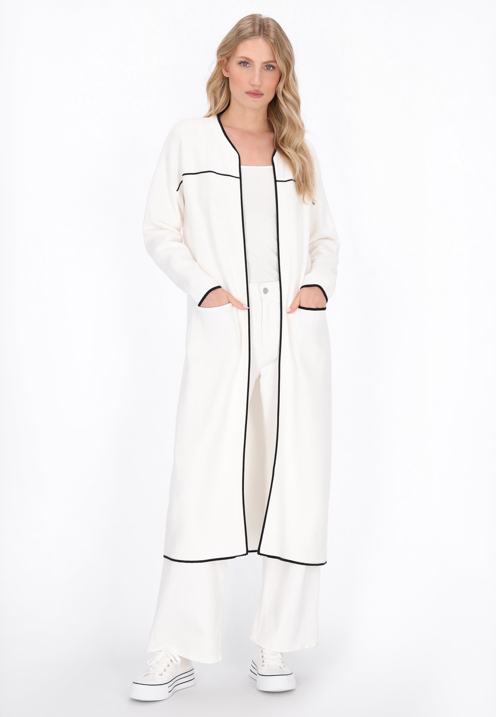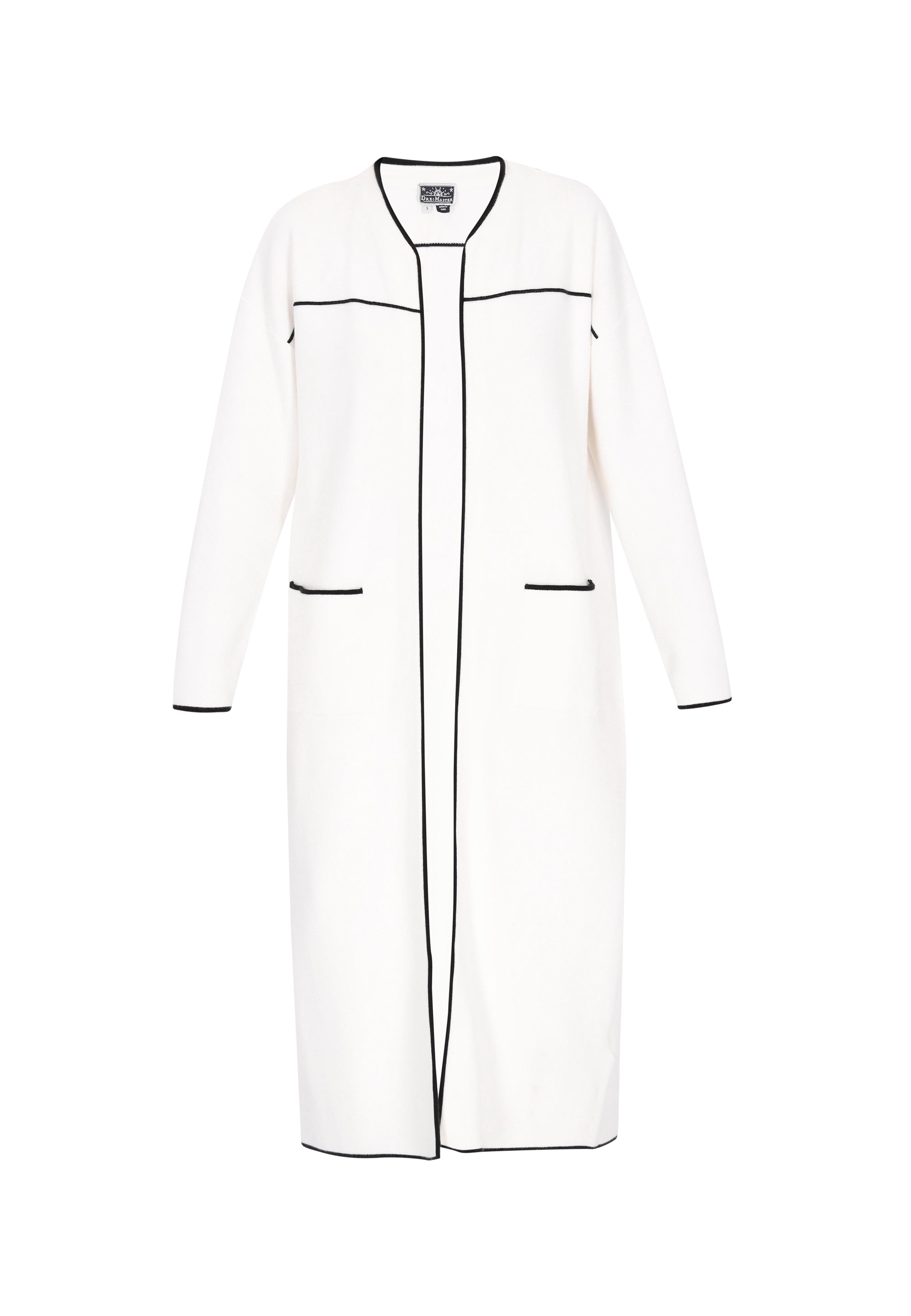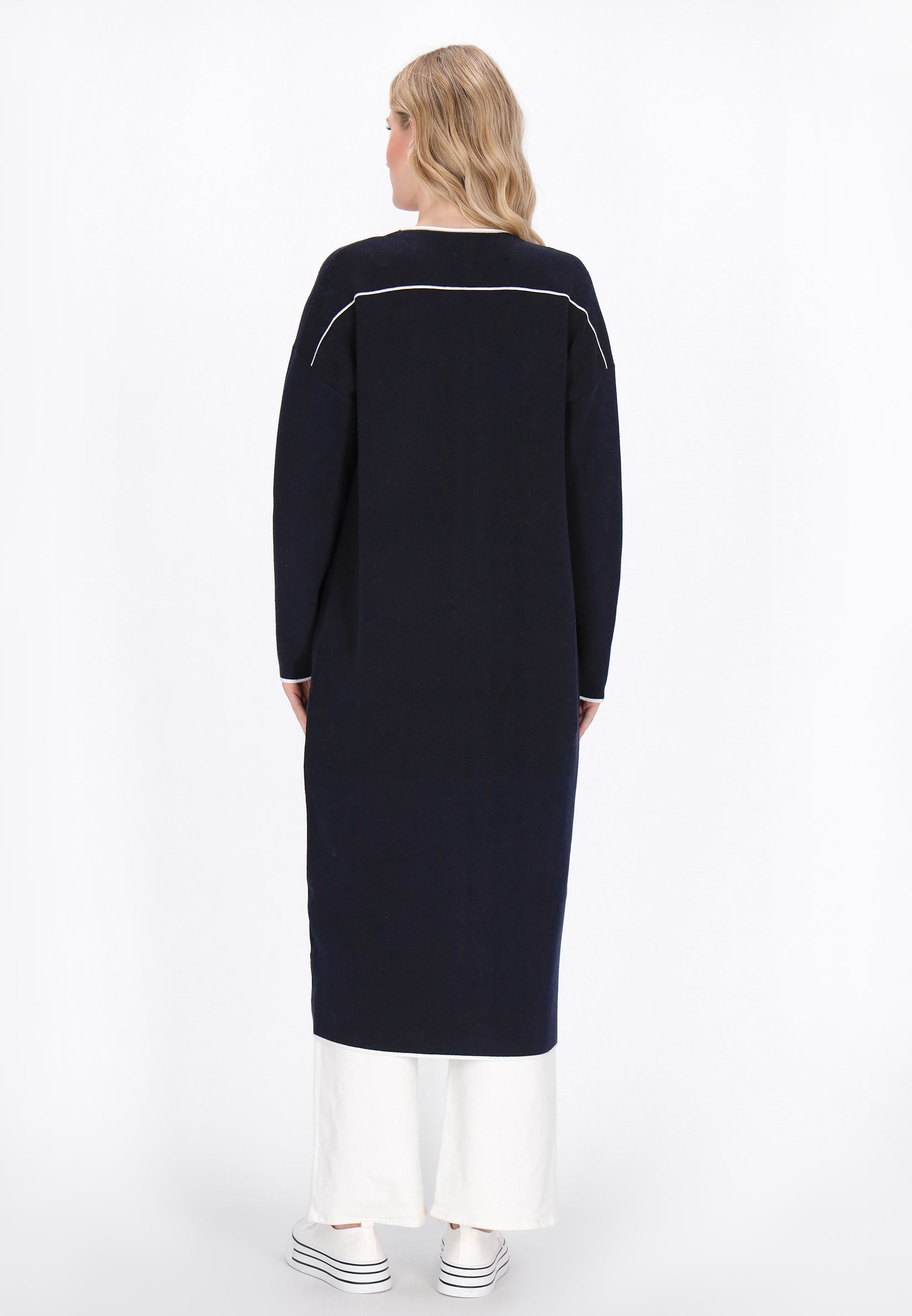 Wrap yourself in comfort with this long knitted cardigan from the Maritime Collection. Designed in a regular fit with an open front and long sleeves, it offers a timeless silhouette. The plain pattern keeps the look clean and classic, while contrasting trim and practical pockets add subtle detail and functionality. Perfect for layering on cooler days, this casual yet elegant item brings effortless style to any outfit.
