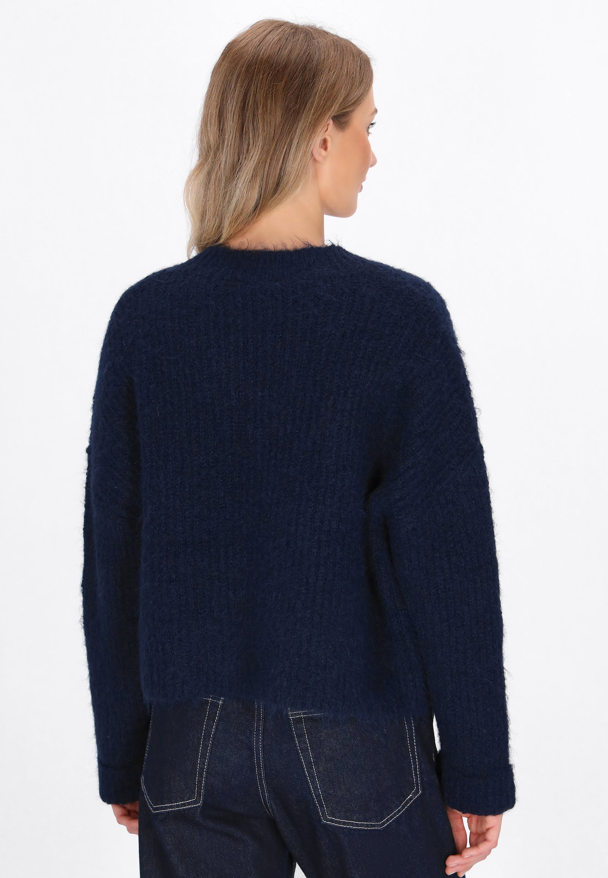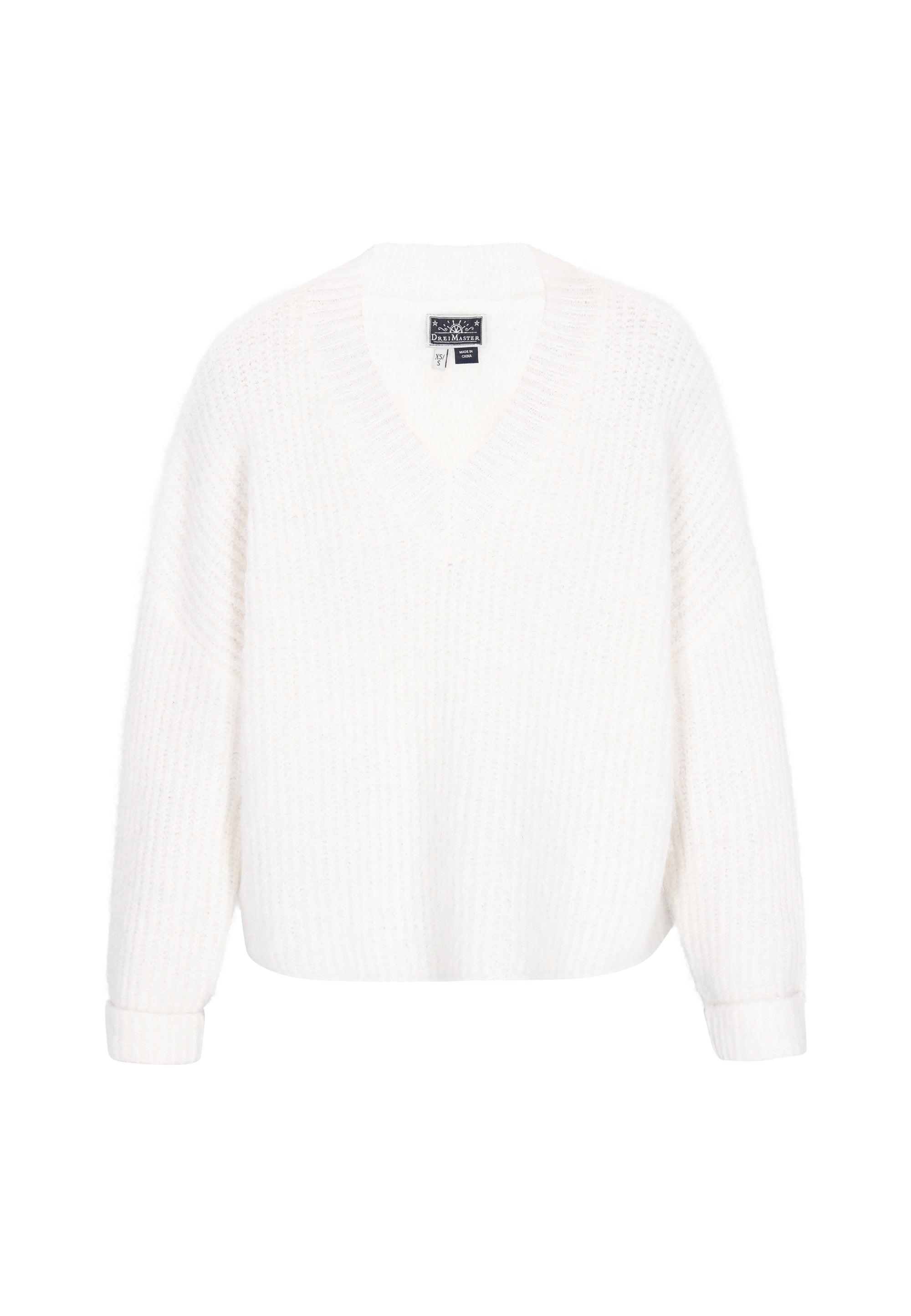 A loose-fitting sweater with a V-neck, crafted from softly knit yarn. It features long sleeves and distinctive dropped shoulders for a relaxed, casual feel. The smooth, solid pattern emphasizes a timeless style, perfect for everyday wear. This comfortable and cozy sweater is a must-have for any wardrobe, combining comfort with classic style. Part of the Maritime Collection.
