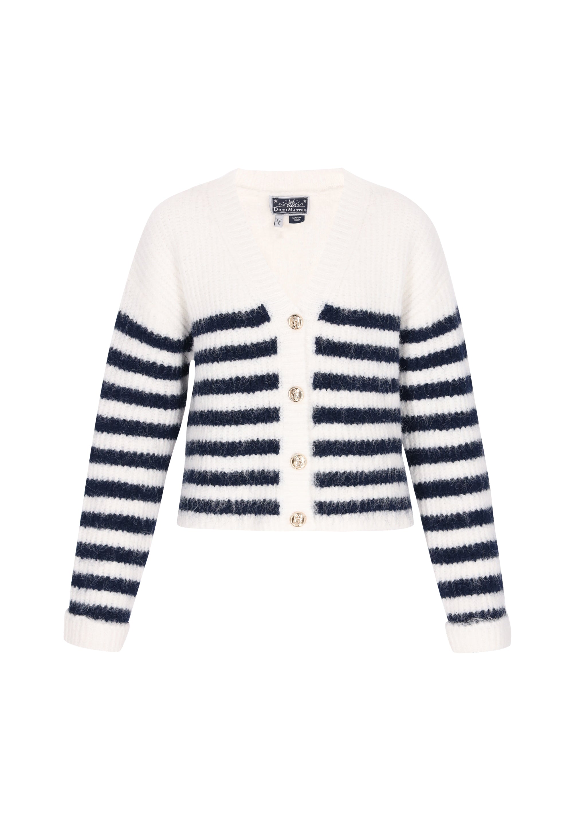 Add a touch of classic maritime style with this regular-fit knitted cardigan from the Maritime Collection. Featuring a flattering V-neck, long sleeves, and a button-up front, its adorned with a timeless stripes pattern that brings casual elegance to any outfit. Made for comfort and versatility, this classic item is perfect for layering and everyday wear.