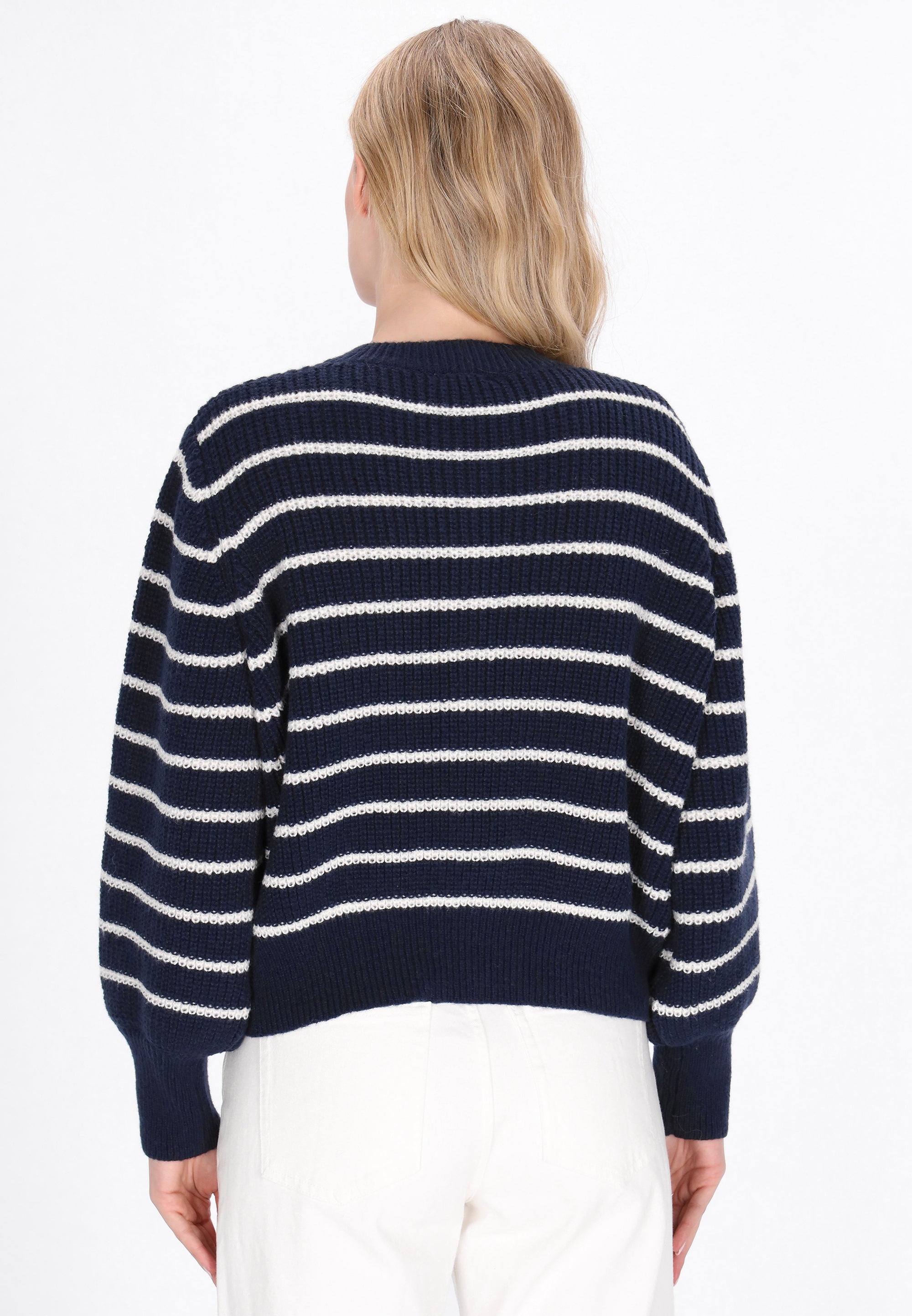 Embrace coastal charm with this relaxed-fit cardigan from the Maritime Collection. Featuring a round neck, long bishop sleeves, and drop shoulders, it offers a soft, flowing silhouette perfect for casual layering. Crafted from cozy knitted fabric with a timeless stripes pattern, it combines comfort with nautical-inspired style. The button-up front is adorned with decorative buttons, adding a touch of elegance to this laid-back piece. Ideal for everyday wear, this cardigan brings effortless comfort and timeless appeal to your wardrobe.