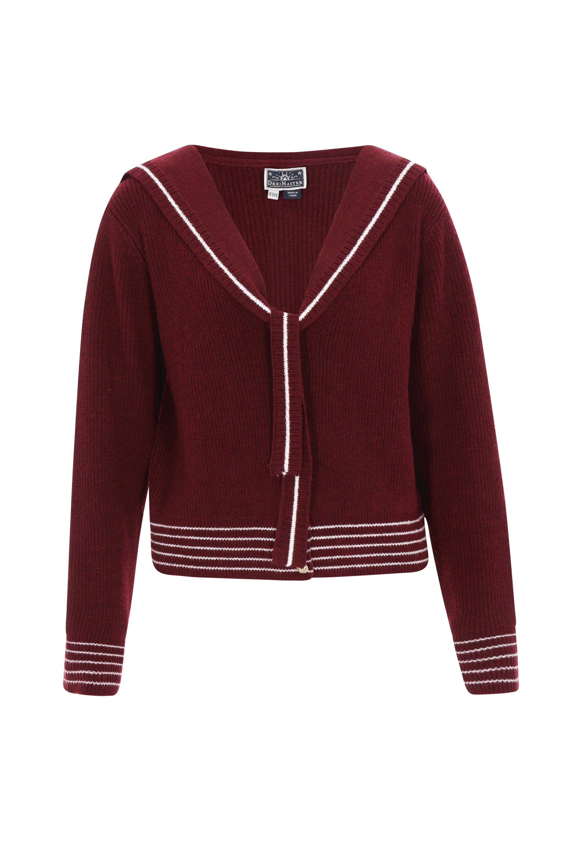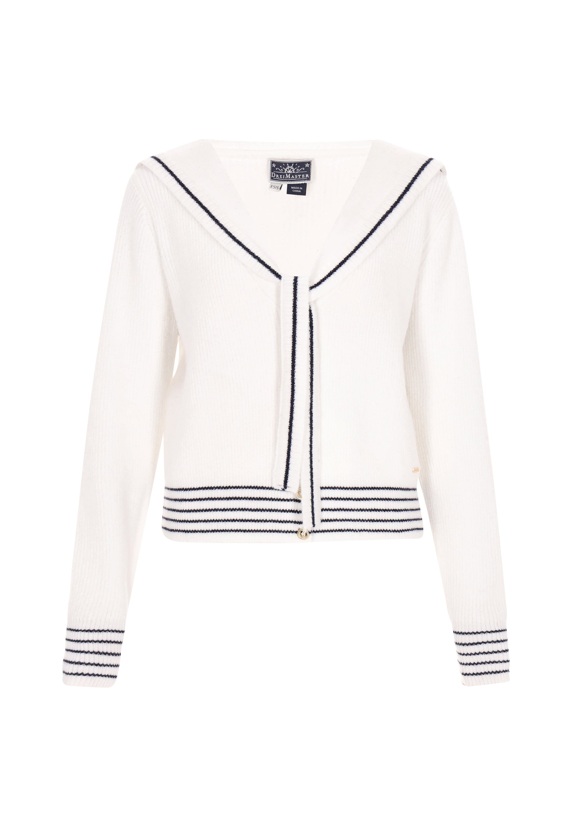 A knitted cardigan from the Maritime Collection that combines classic style with a nautical accent. The characteristic sailor collar and contrasting finishes give it a unique, nautical character. The button-up model with long sleeves and a plain pattern will work perfectly in everyday, casual styles. The cardigan presents a timeless design and the comfortable cut ensures freedom of movement.