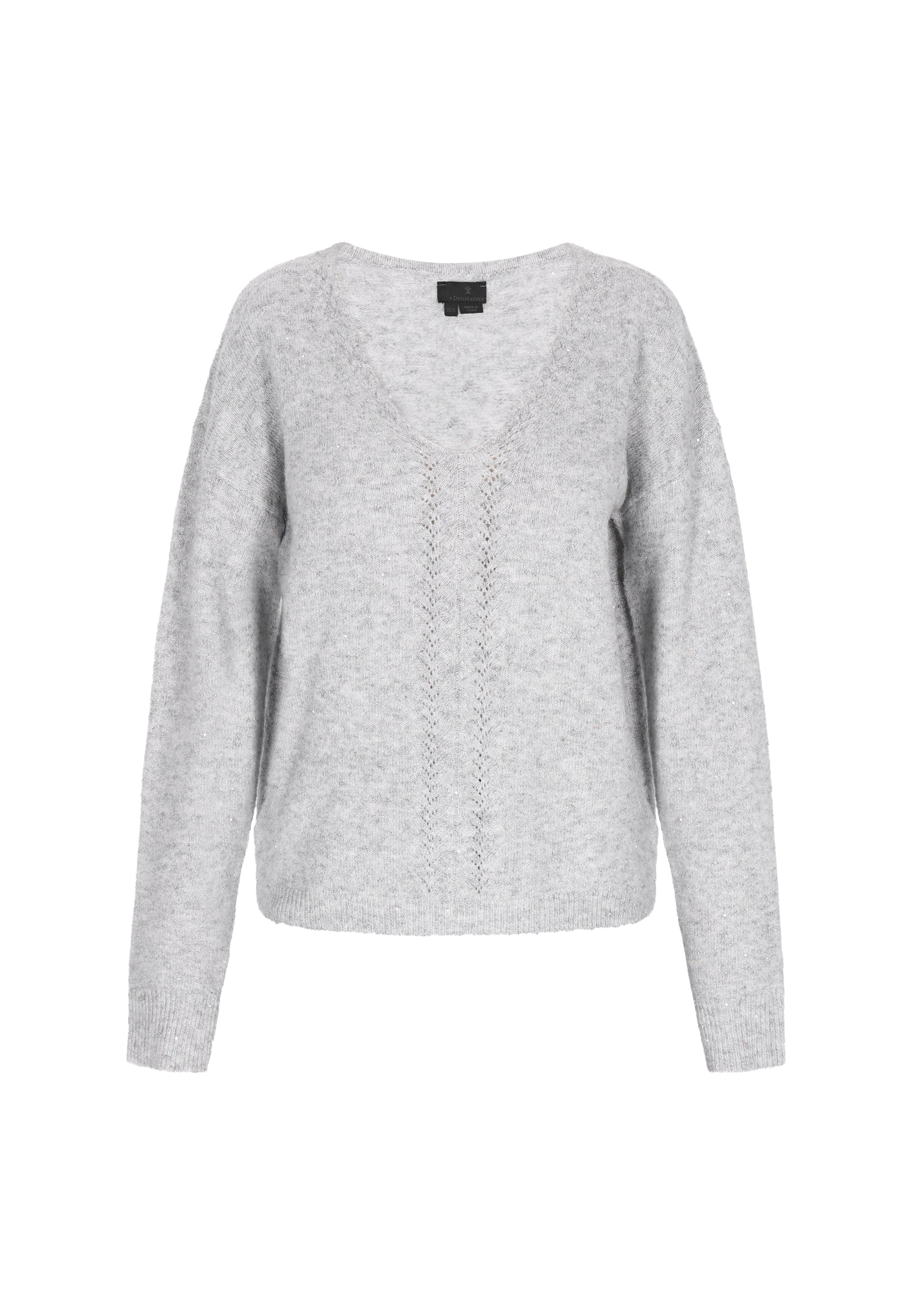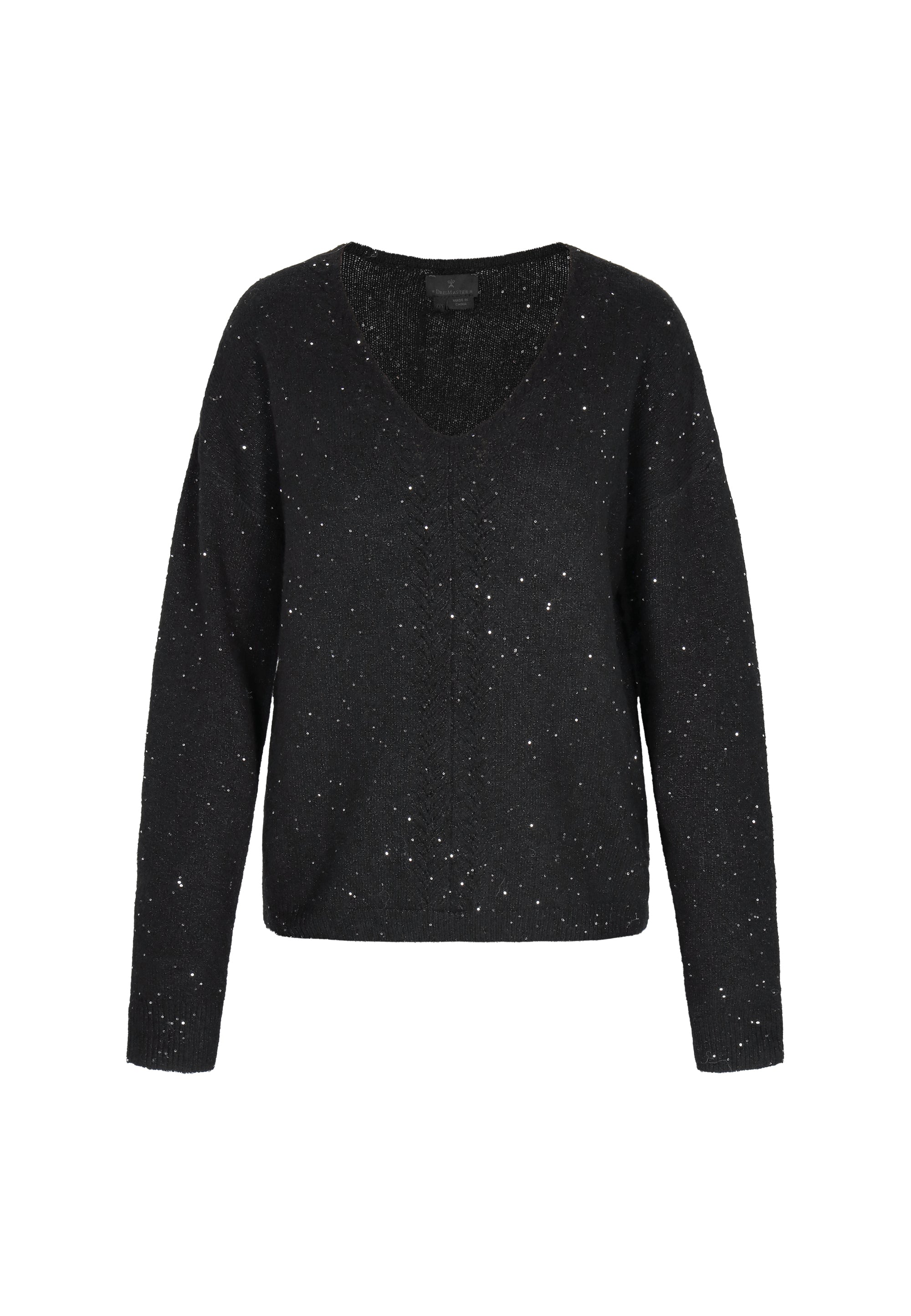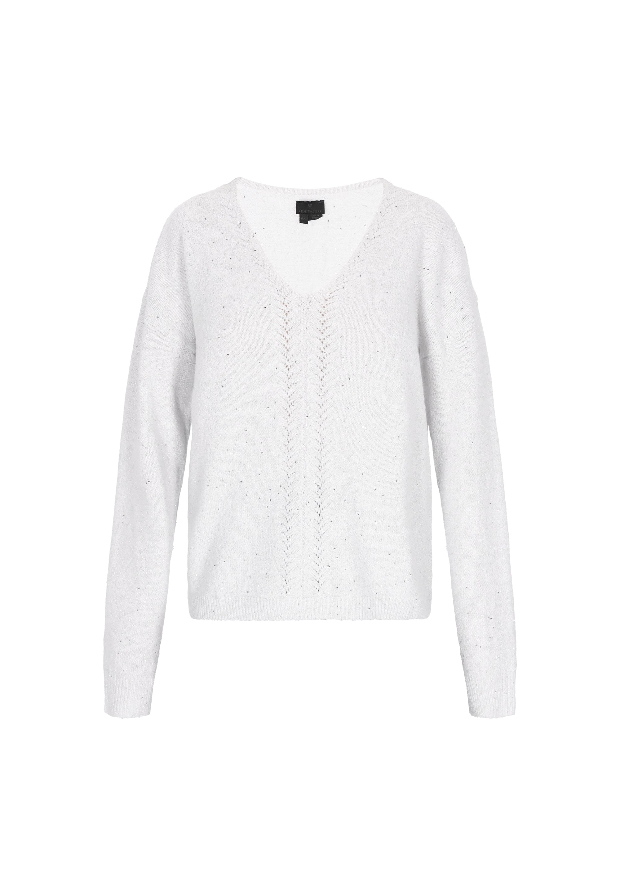 This knit sweater has a loose fit with a deep V-neck and long sleeves, with dropped shoulders for added comfort. Embellished with sequins and shiny thread, the ajour pattern highlights its timeless charm. Perfectly casual yet chic, this model from the Classic Collection is ideal for layering or wearing solo on cooler days.