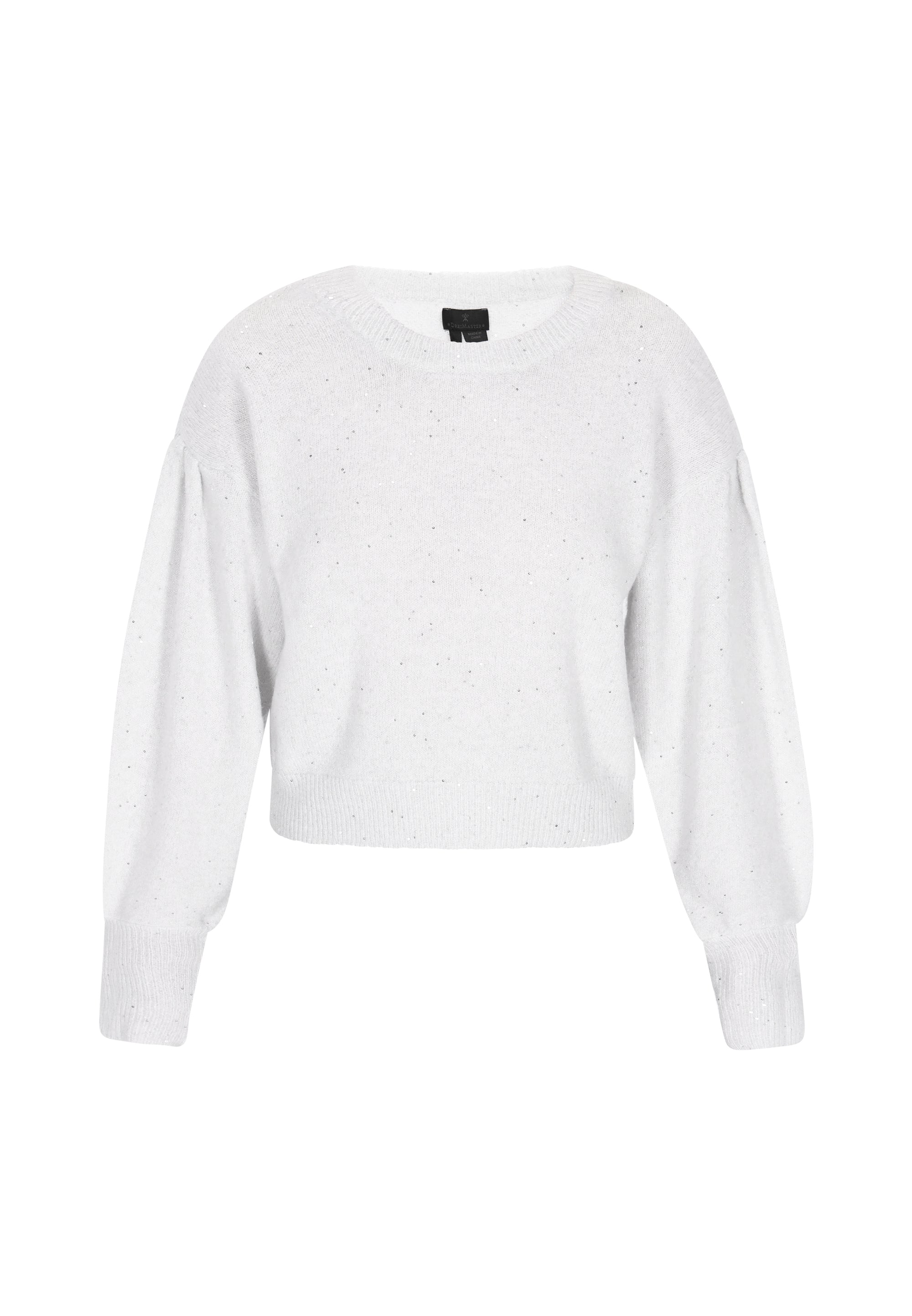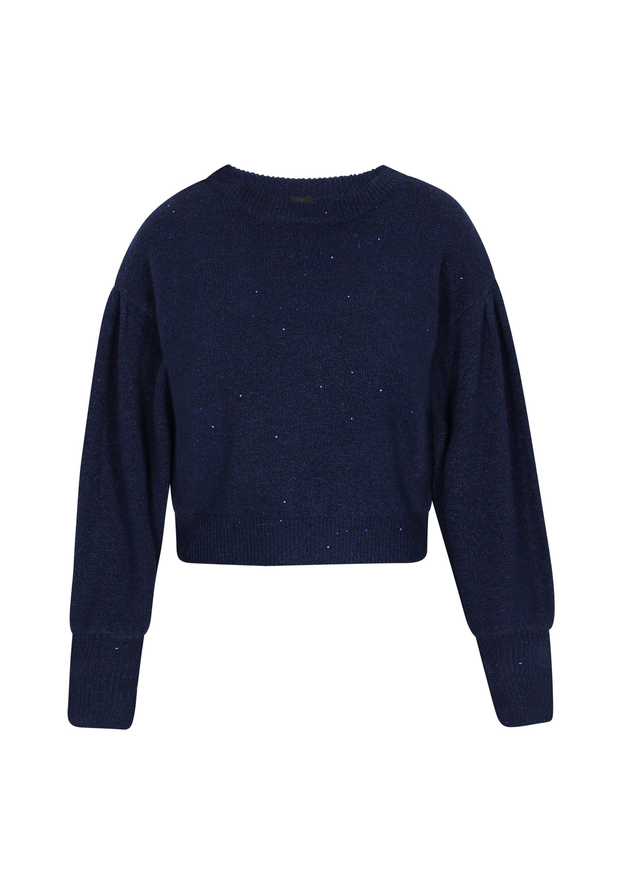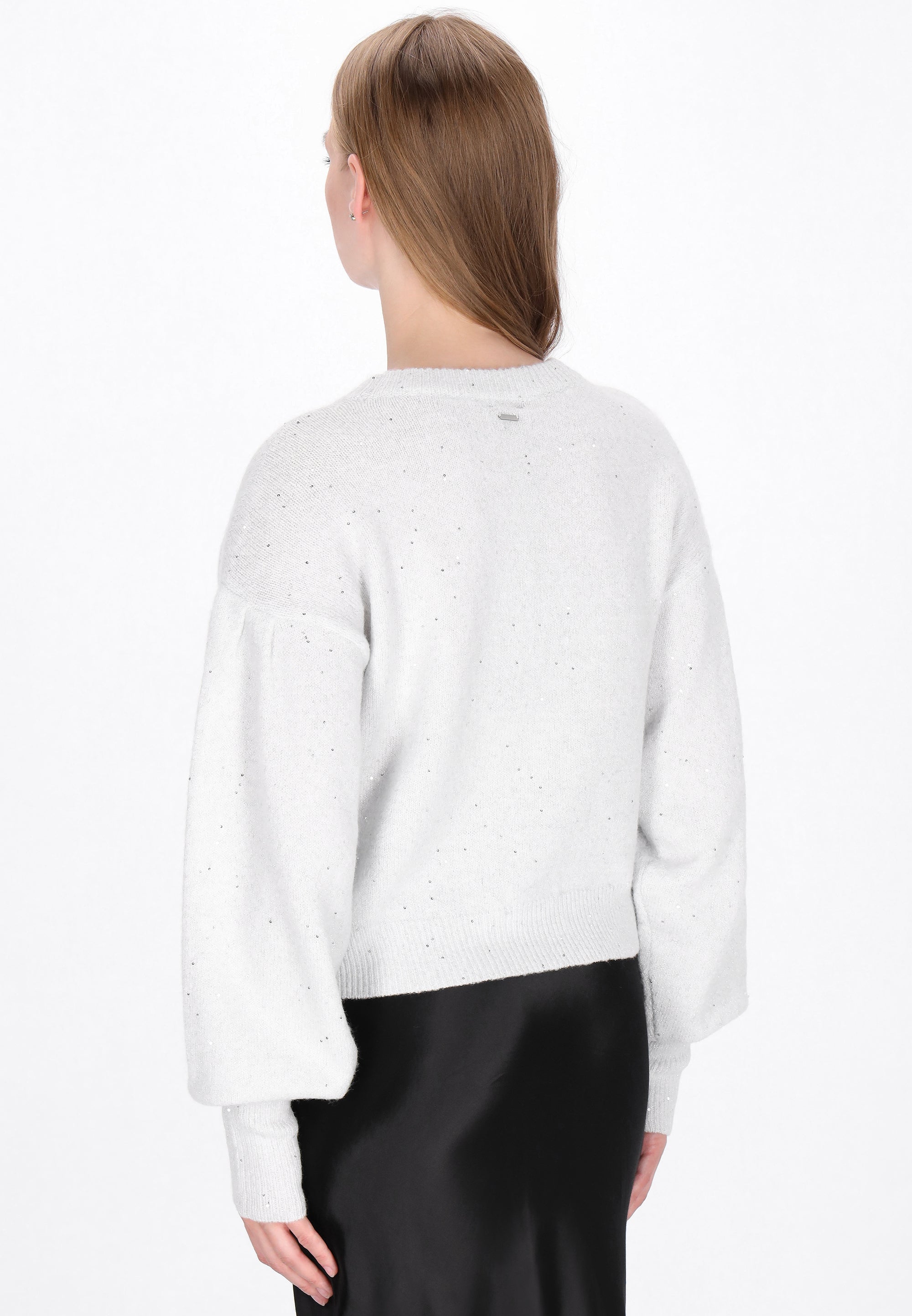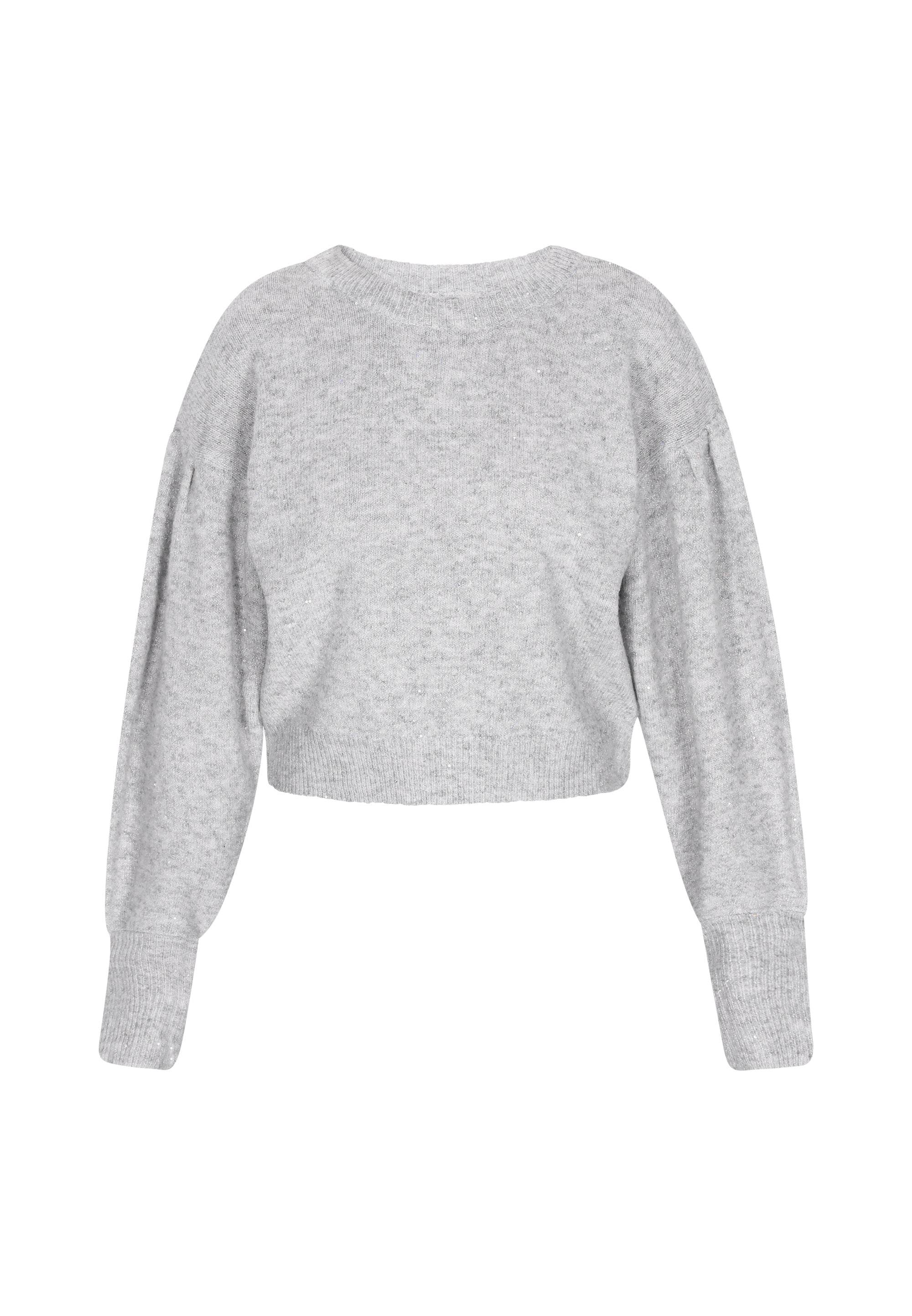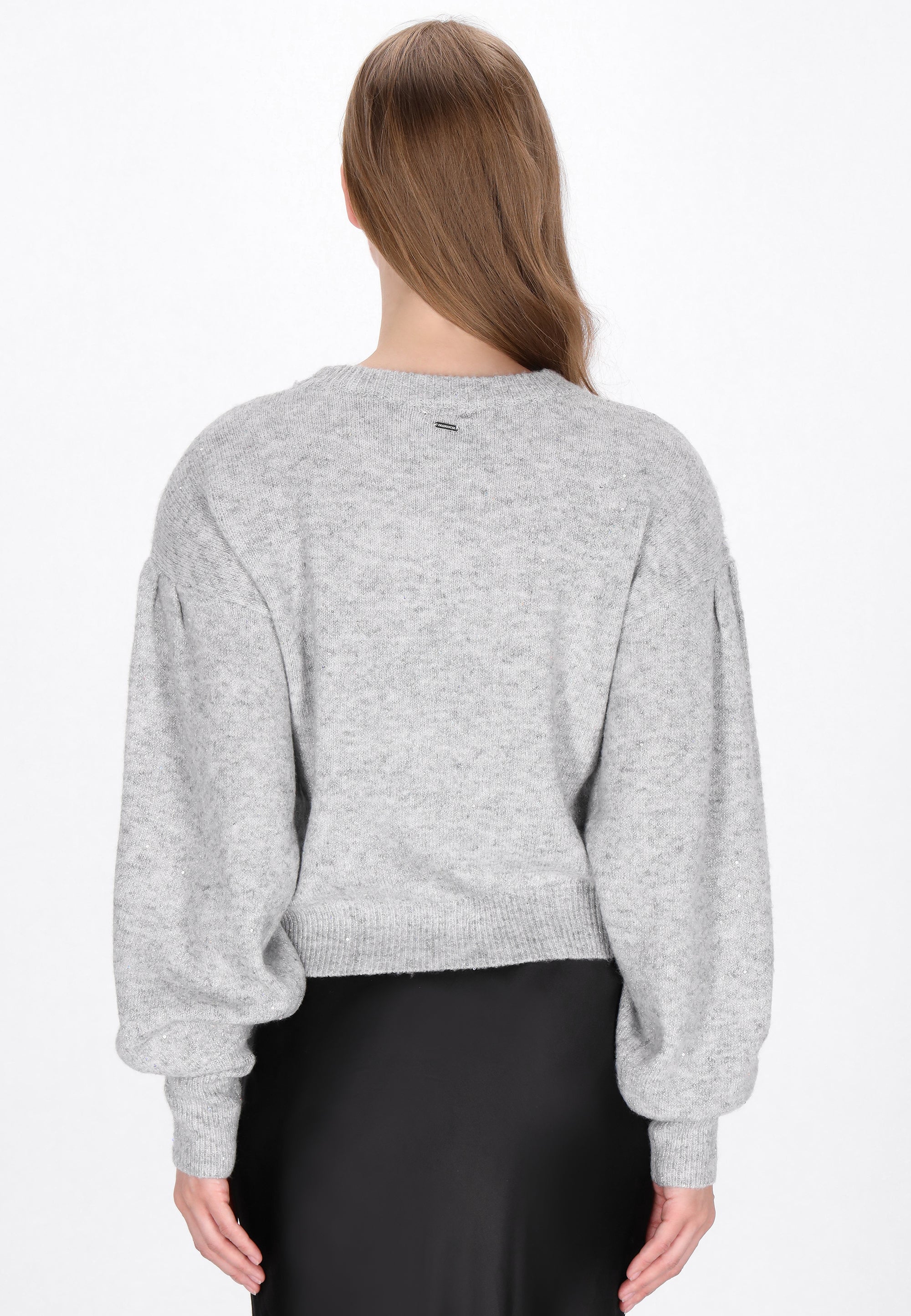 Add a subtle sparkle to your everyday wardrobe with this relaxed-fit sweater from our Classic Collection. Featuring a classic round neckline, long lantern sleeves, and a drop shoulder design, it combines timeless style with modern comfort. Woven with metallic thread and accented with delicate sequins, this knitted item in a plain pattern offers casual elegance and cozy wearability. Perfect for effortless layering or standalone style, its a versatile addition to any closet.