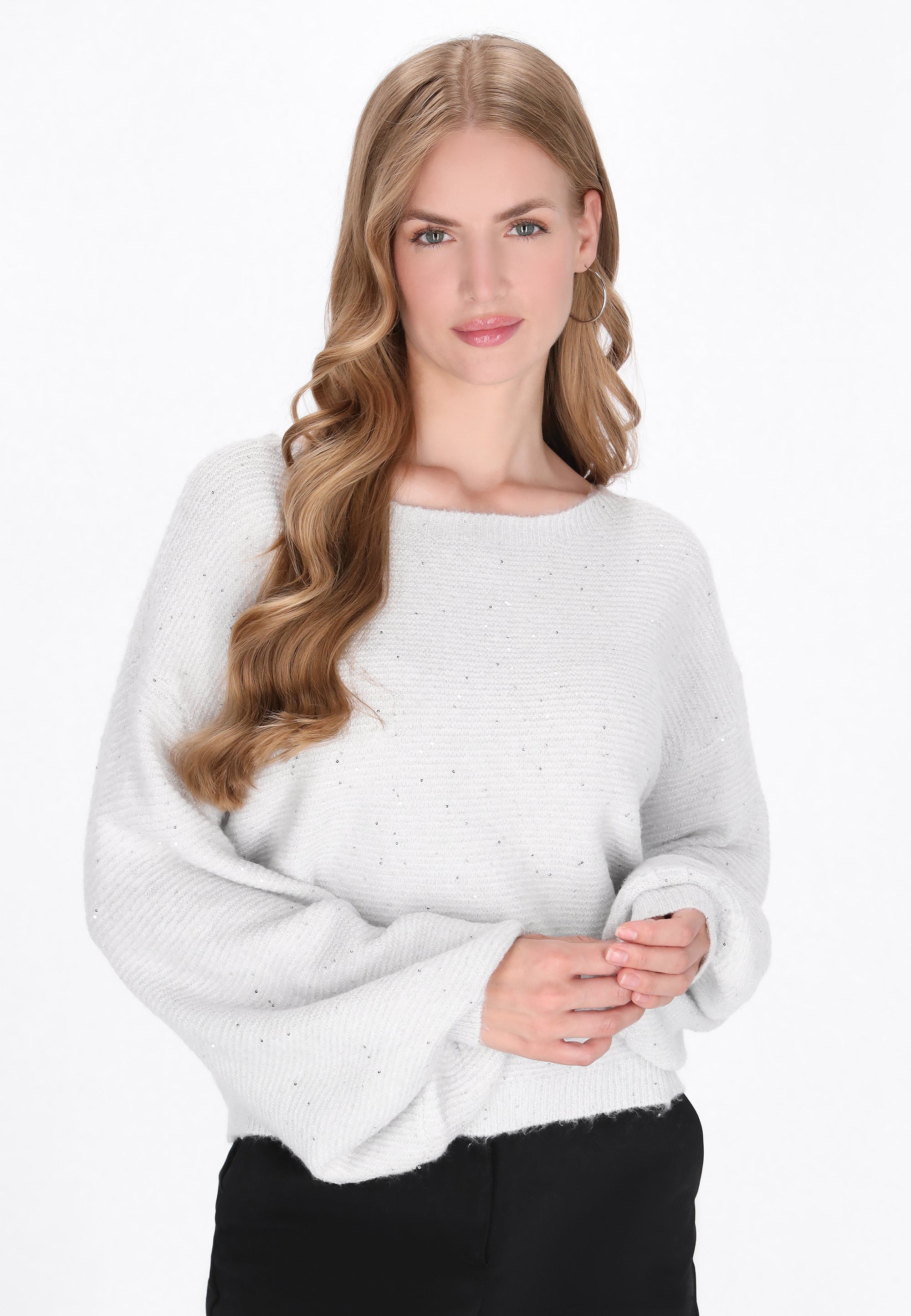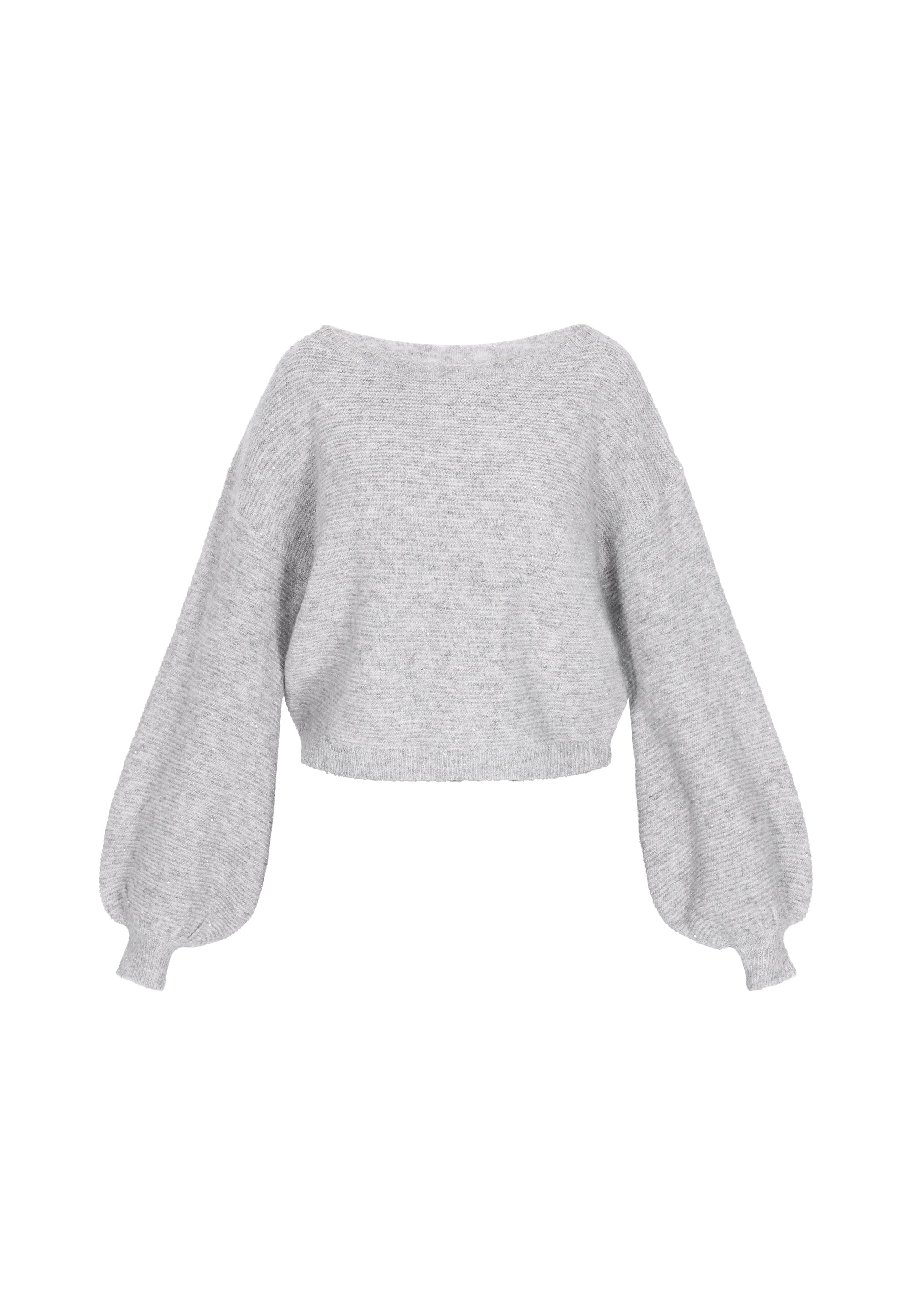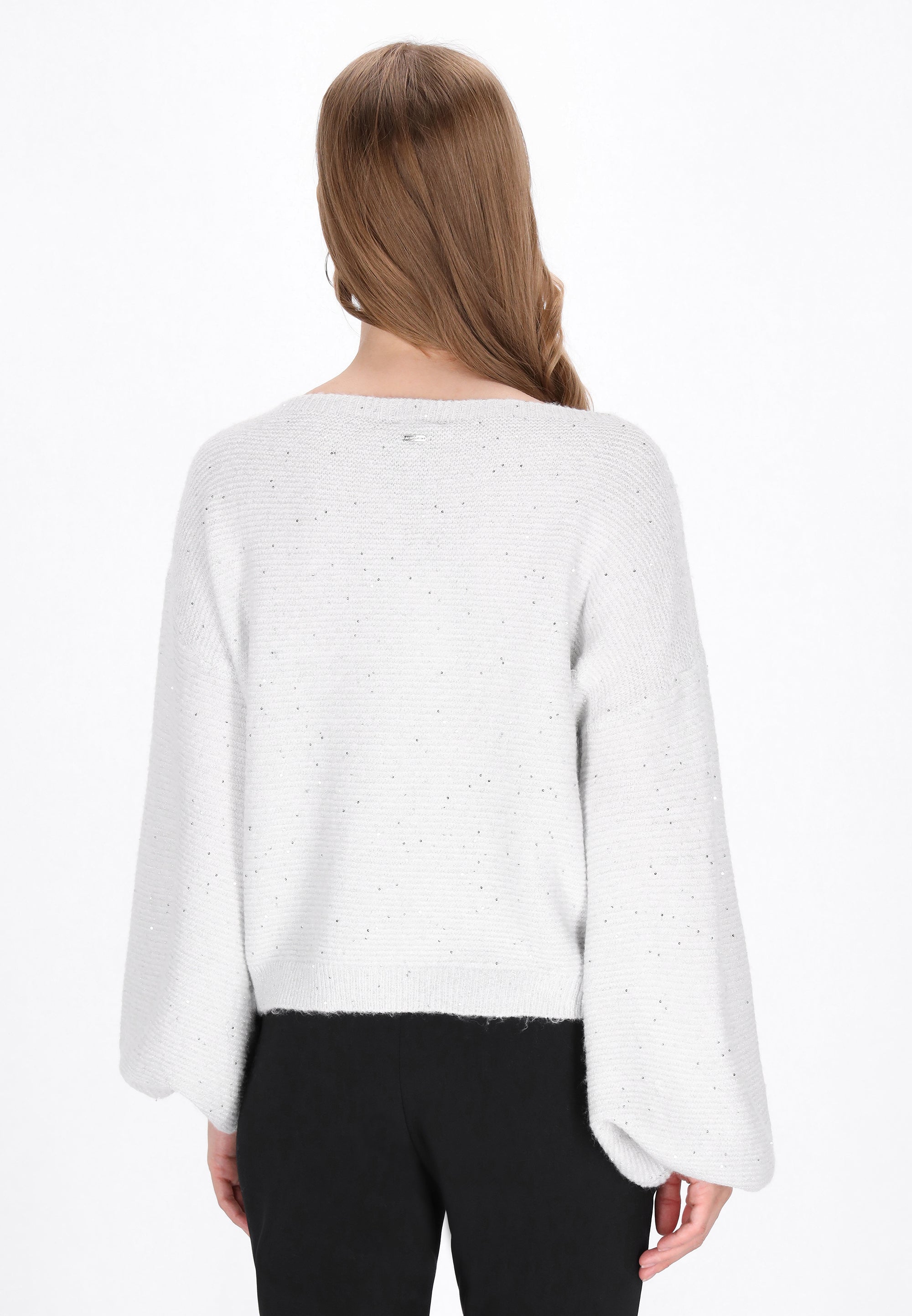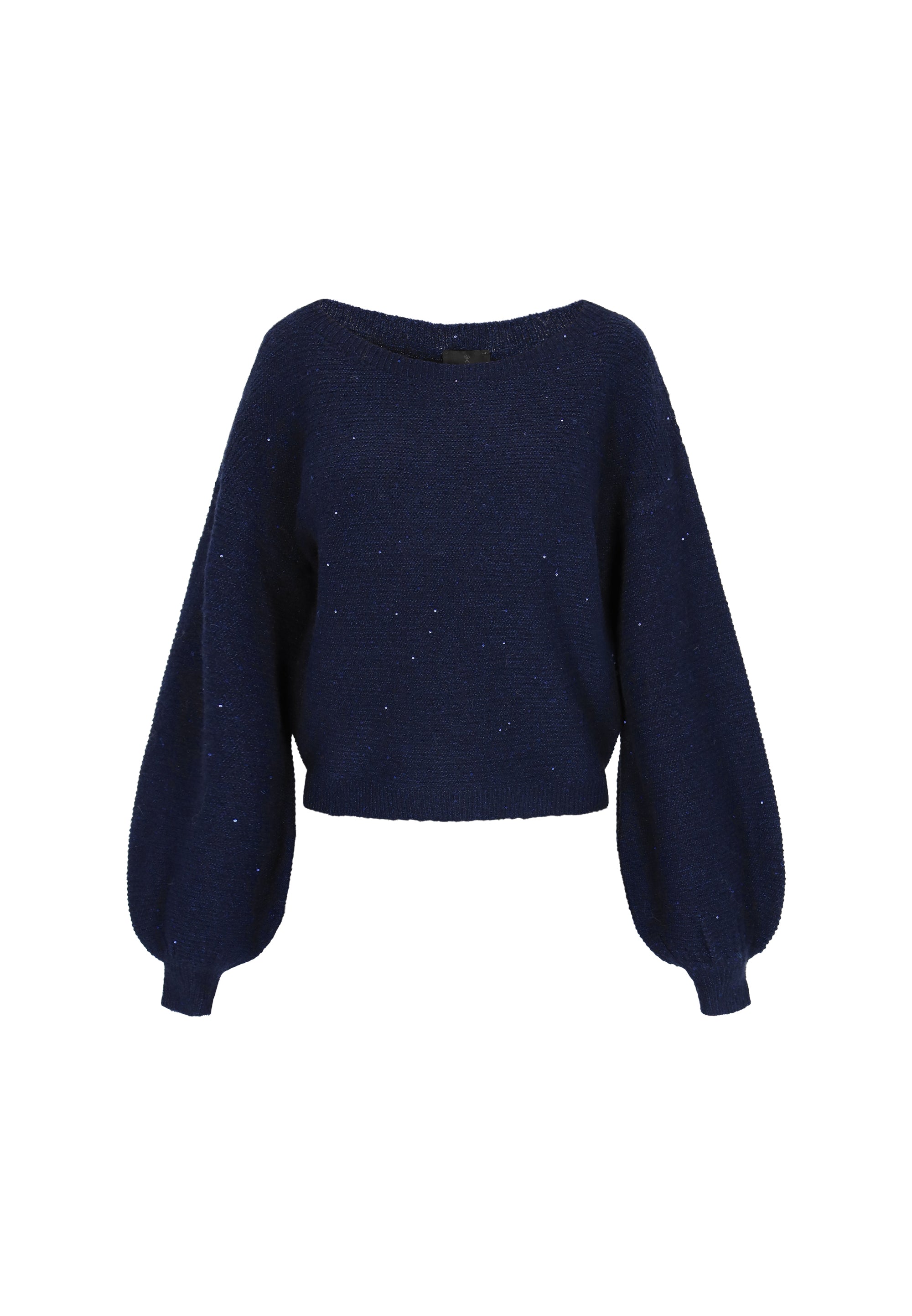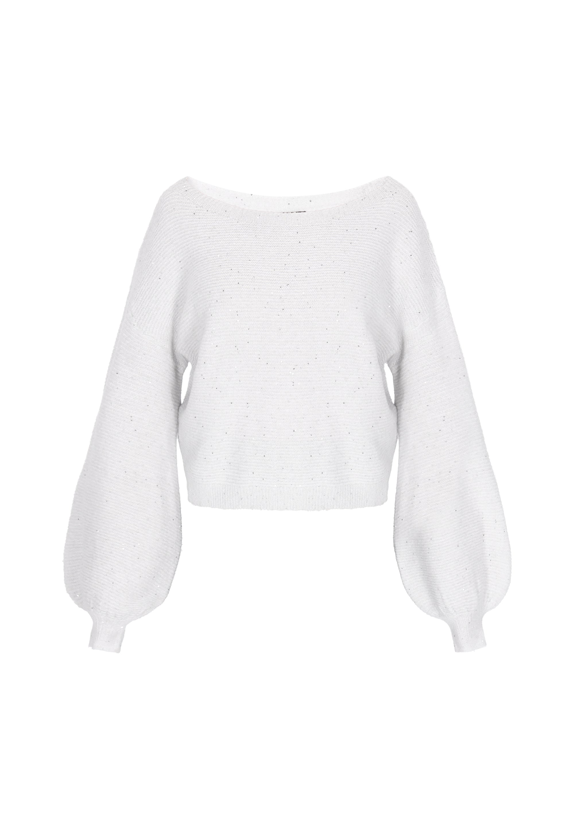 This timeless sweater features a relaxed fit with a wide boat neckline and long, bishop sleeves that create an elegant silhouette. Drooping shoulders add casual charm, while the soft knit fabric ensures comfortable wear. Embellished with sequins and shiny thread, this classic sweater is perfect for adding variety to your closet for any occasion. It is part of the Classic Collection.