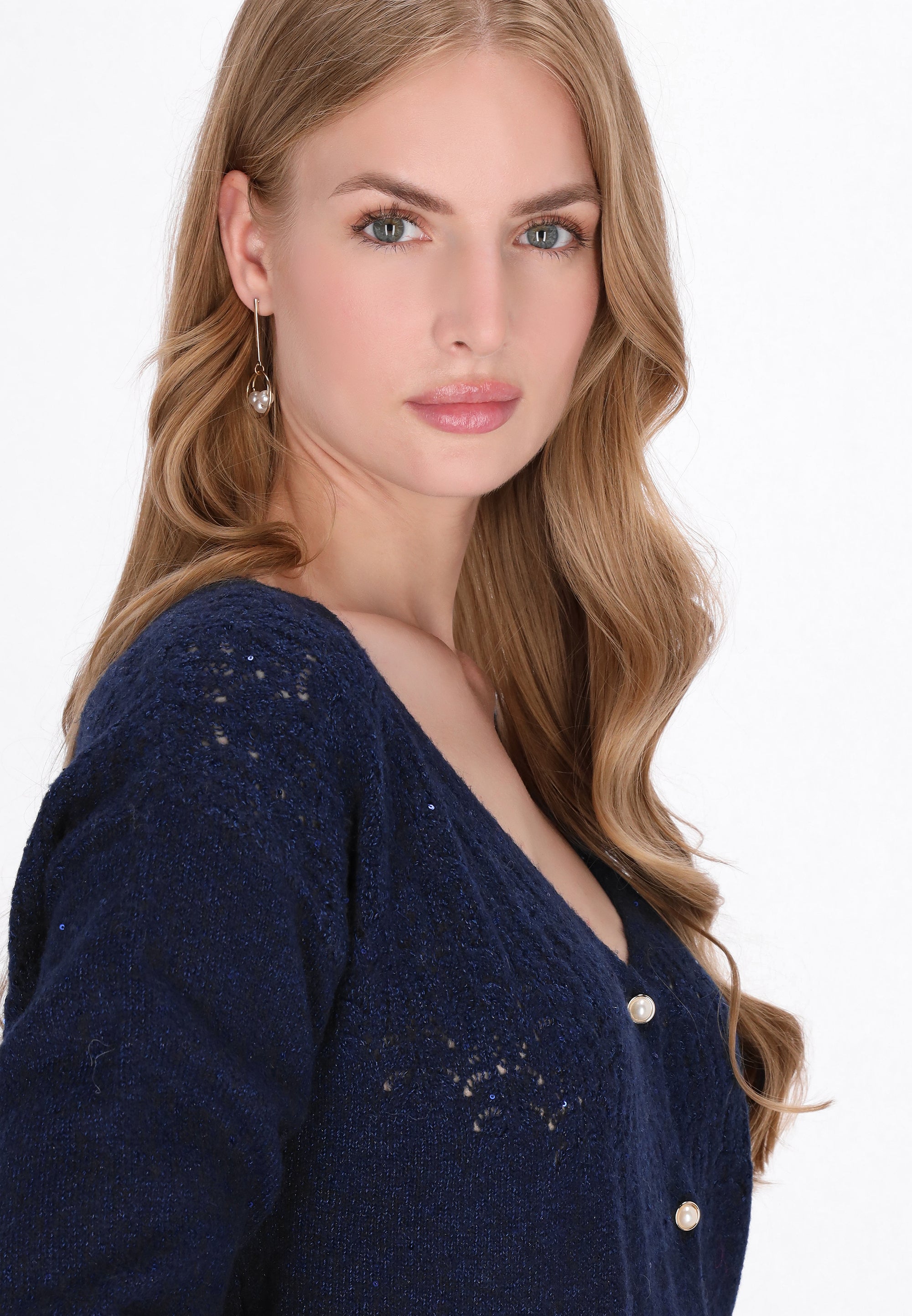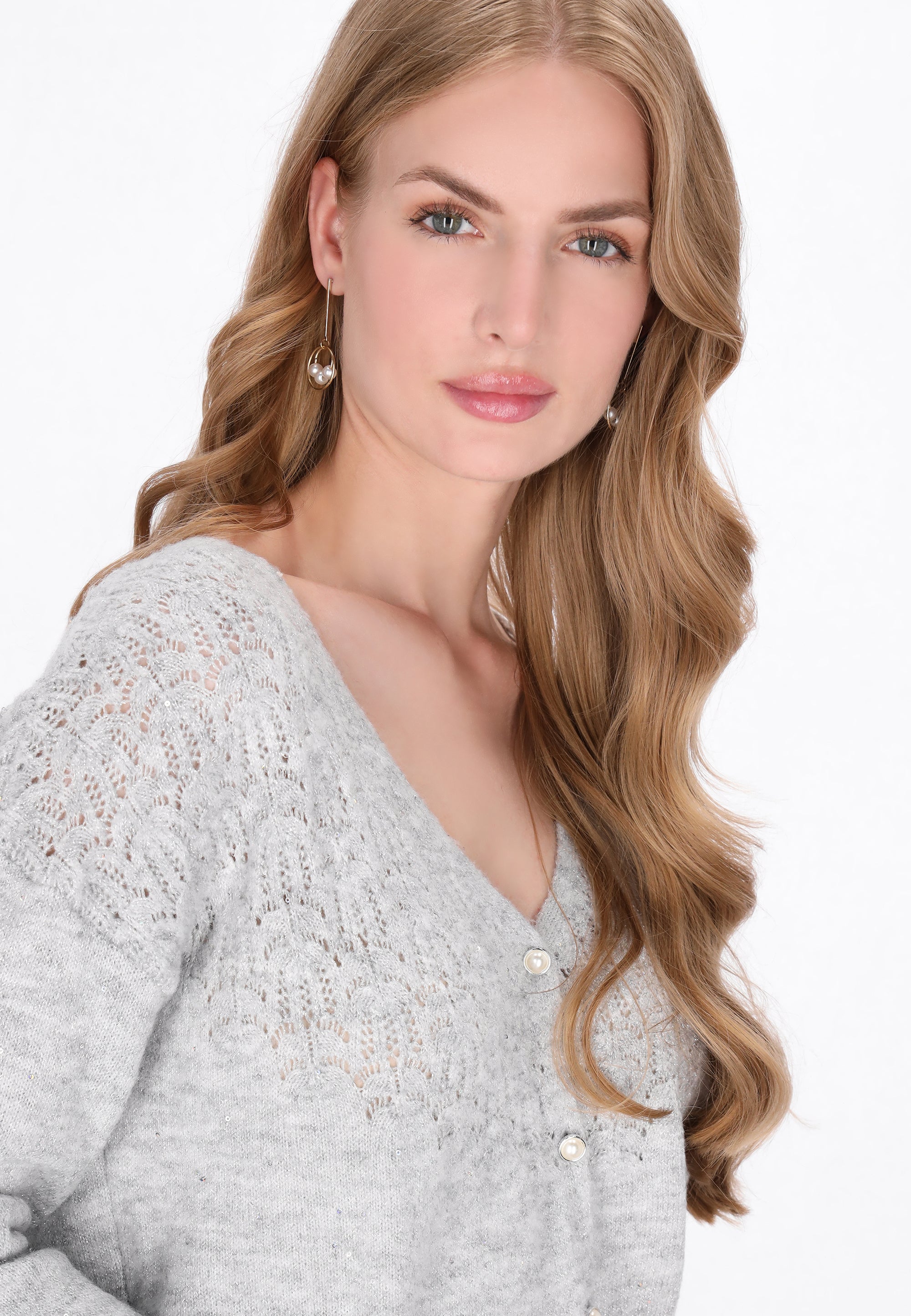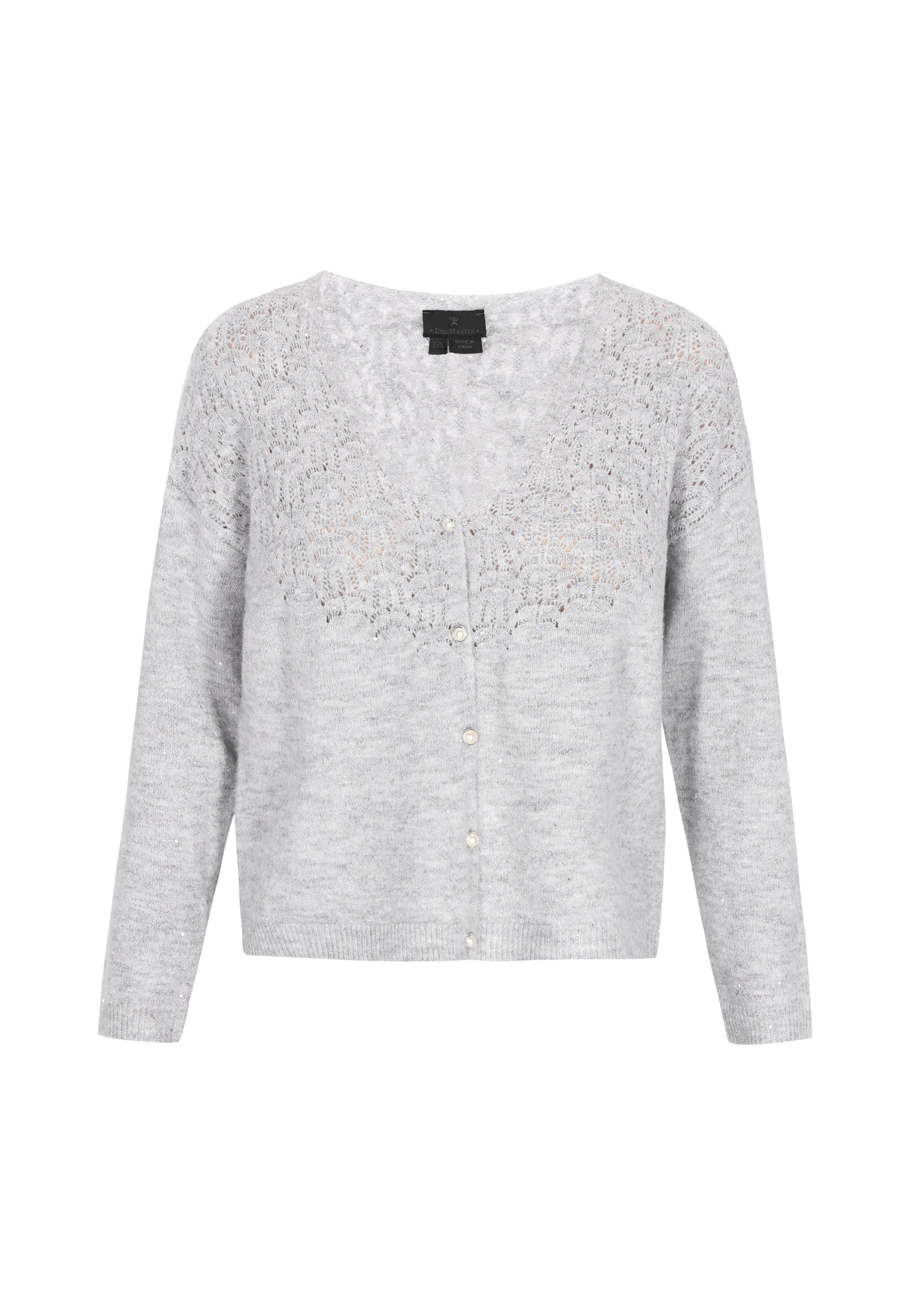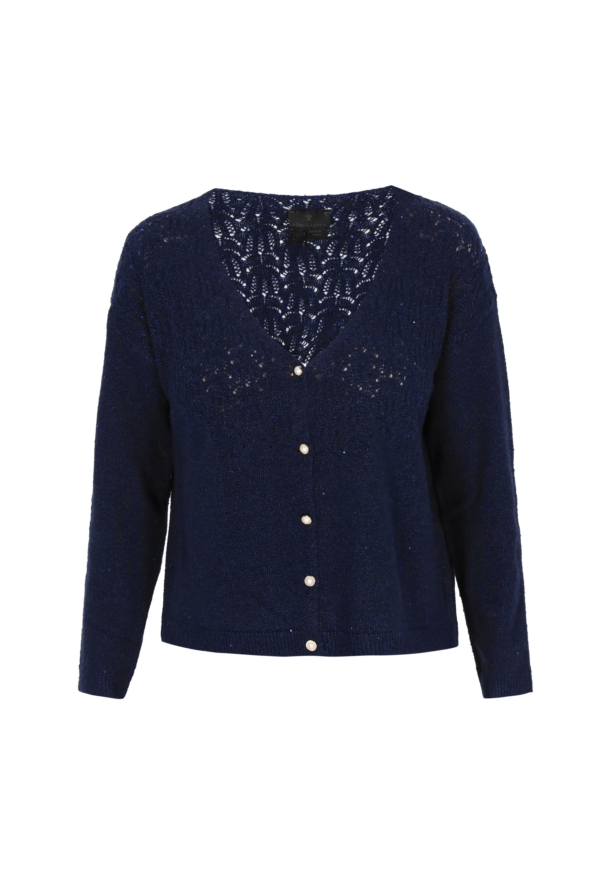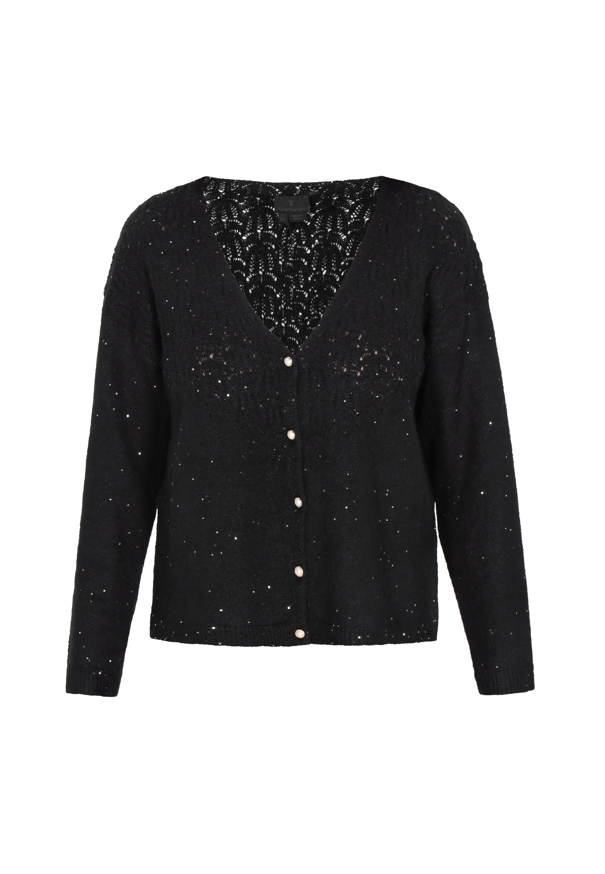 Discover the charm of this loose-fitting cardigan with a deep scoop neckline and long sleeves. Designed with a front button closure and dropped shoulders for a modern vibe, it features sequins and shiny thread for extra sparkle. The ajour pattern enhances its classic look, making it a comfortable yet stylish choice from our timeless Classic Collection.